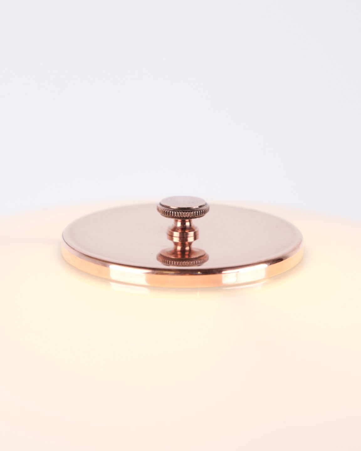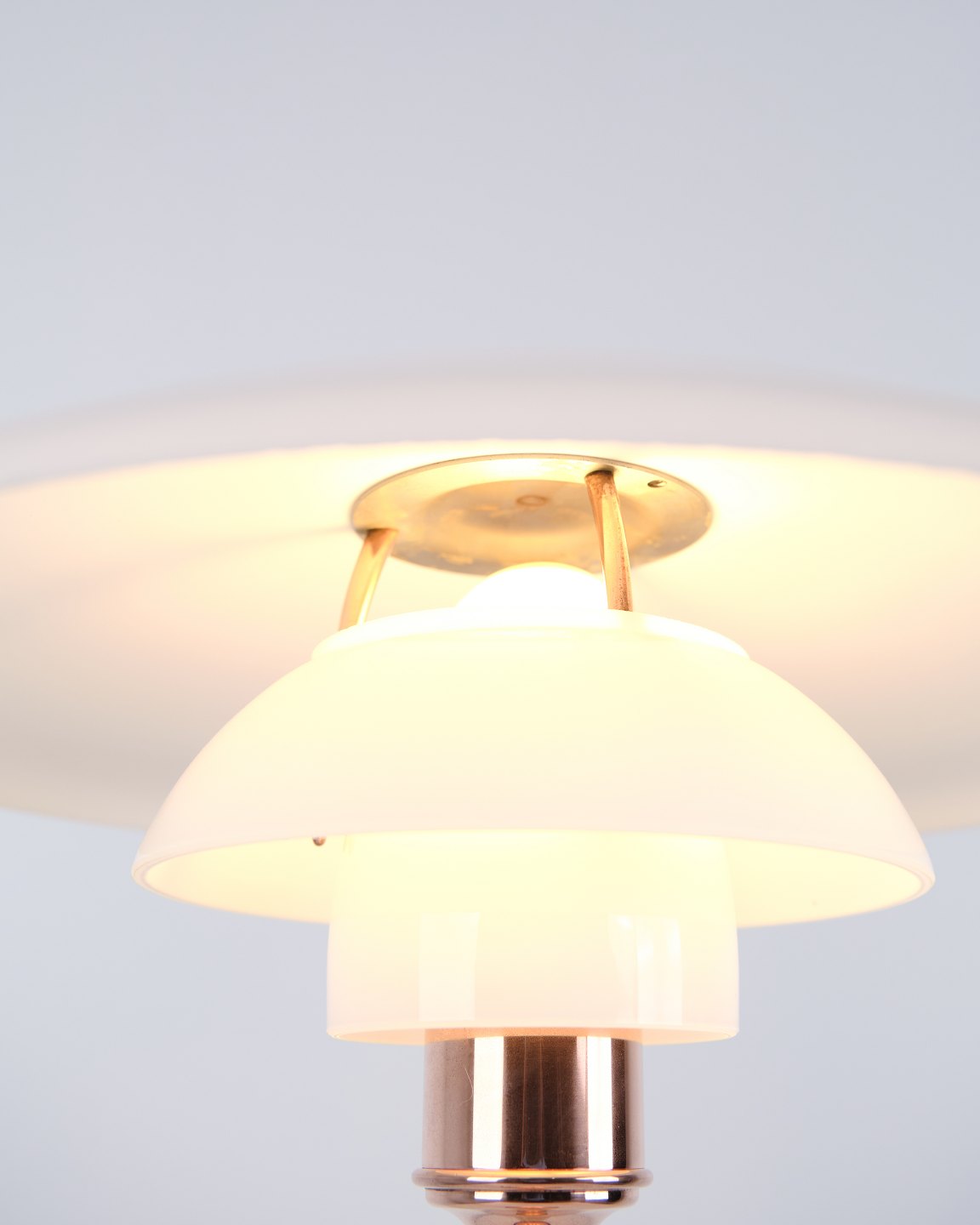 PH Tischlampe Modell PH 3½-2½ Limited Edition, entworfen von Poul Henningsen und hergestellt von Louis Poulsen. Die Lampe ist aus Kupfer gefertigt mit oberem Schirm aus weißem Opalglas sowie zwei unteren Schirmen aus weißem Opalglas. Das Modell wurde im Jahr 2015 nur für einen begrenzten Zeitraum verkauft.