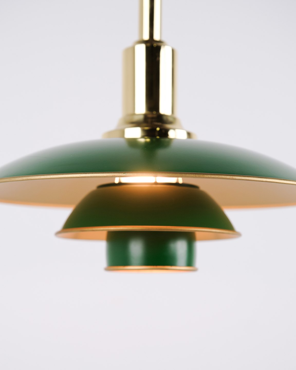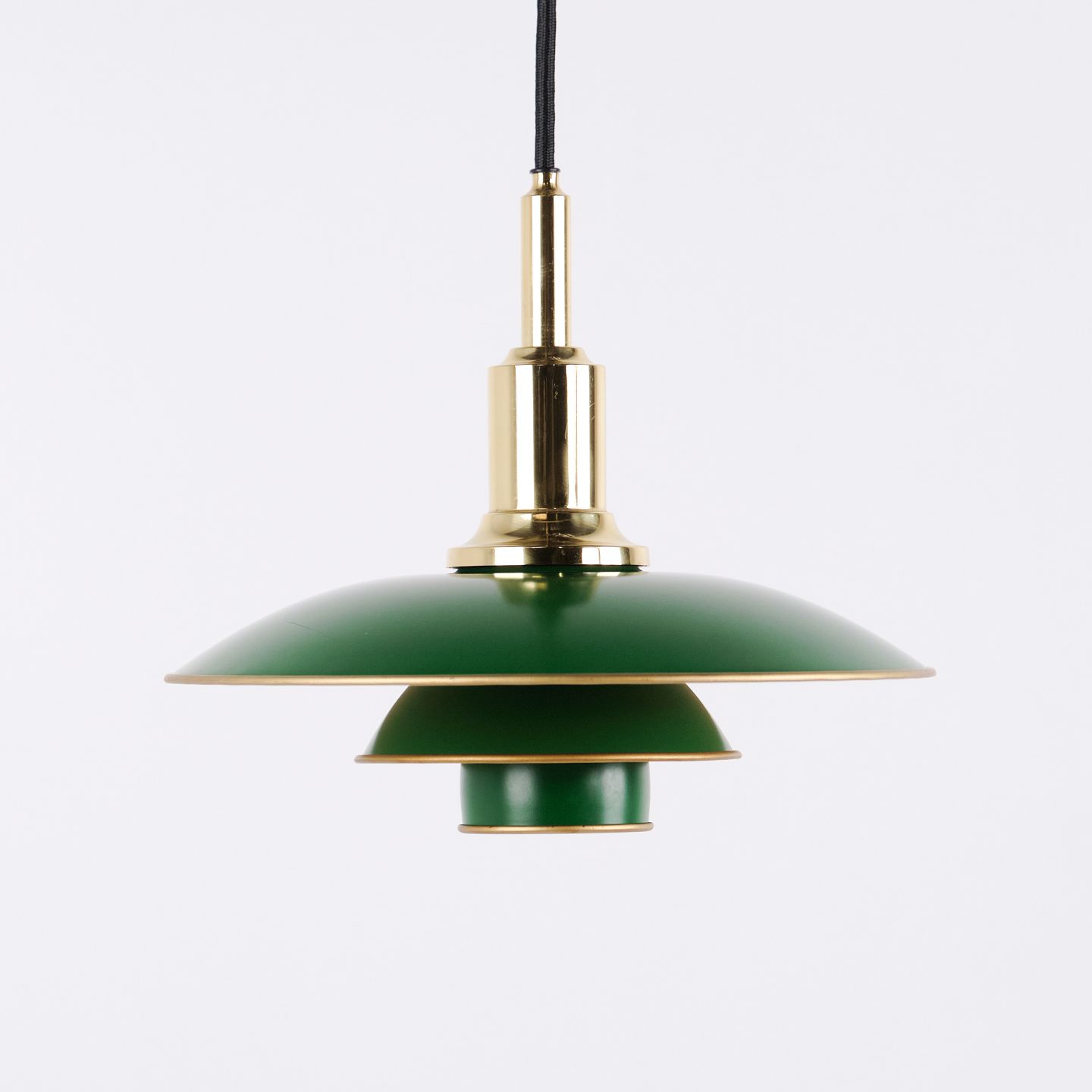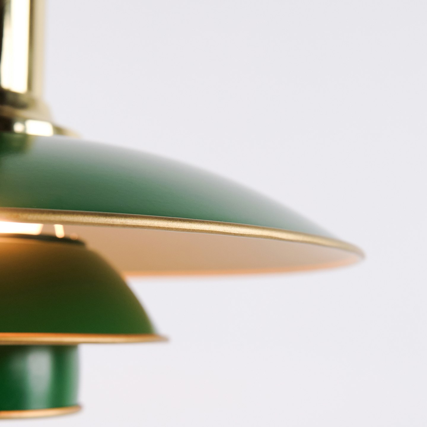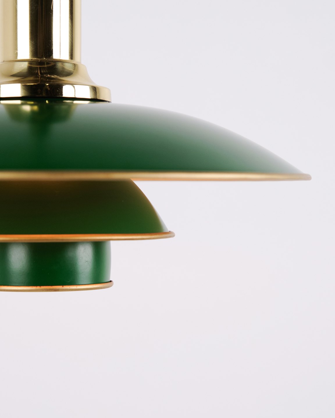 PH 3/2 Pendelleuchte, entworfen von Poul Henningsen und 1996 als Jubiläumsausgabe von Louis Poulsen herausgegeben. Die Leuchte ist aus Messing mit grünen Metallschirmen gefertigt, was dem Modell ein markantes und klassisches Erscheinungsbild verleiht. PH 3/2 gehört zu Poul Henningsens bekannten Dreischirmleuchten, entwickelt für blendfreies und angenehmes Licht. Die Jubiläumsausgabe wurde nur für einen begrenzten Zeitraum produziert und war auch in einer Variante mit roten Metallschirmen erhältlich.