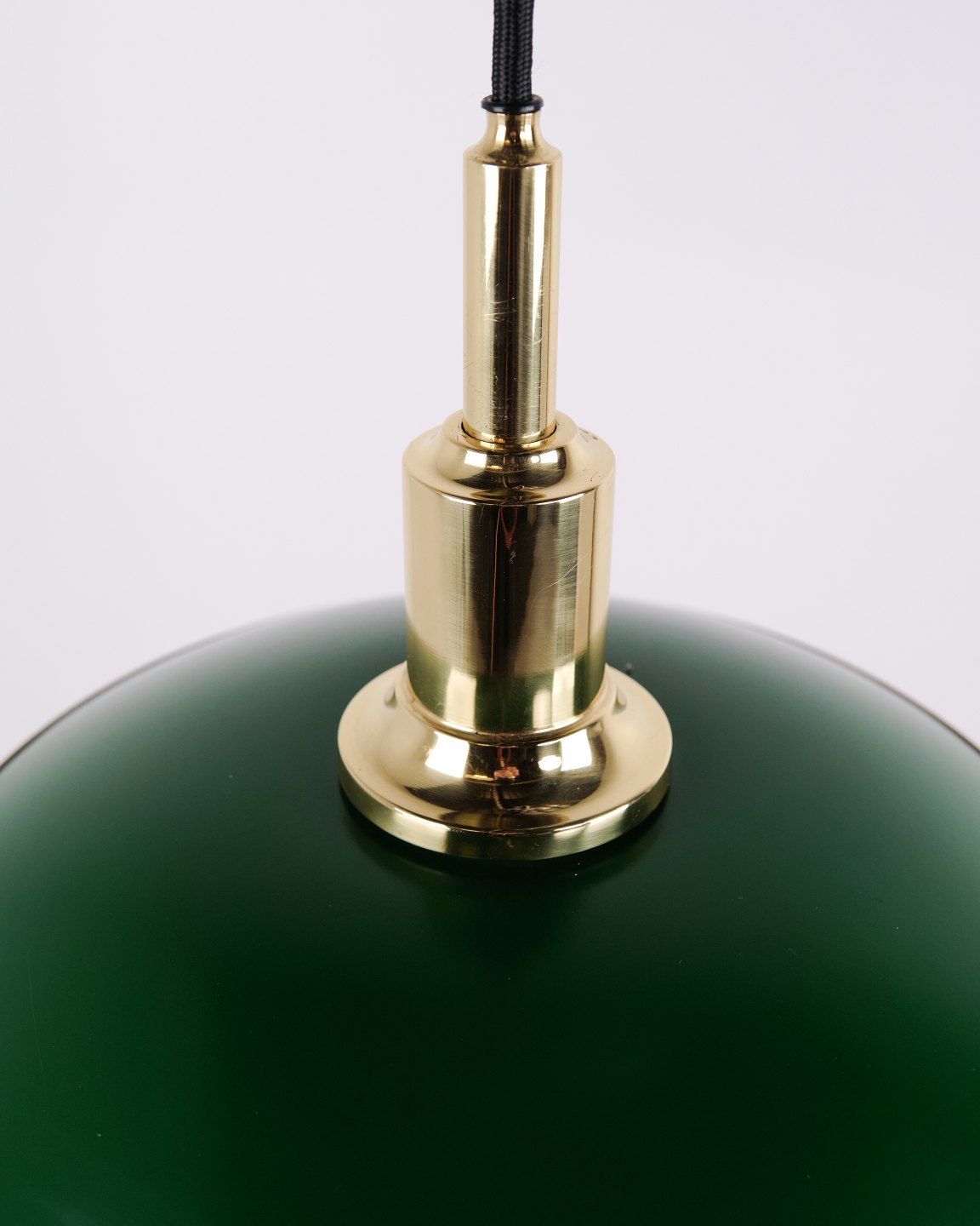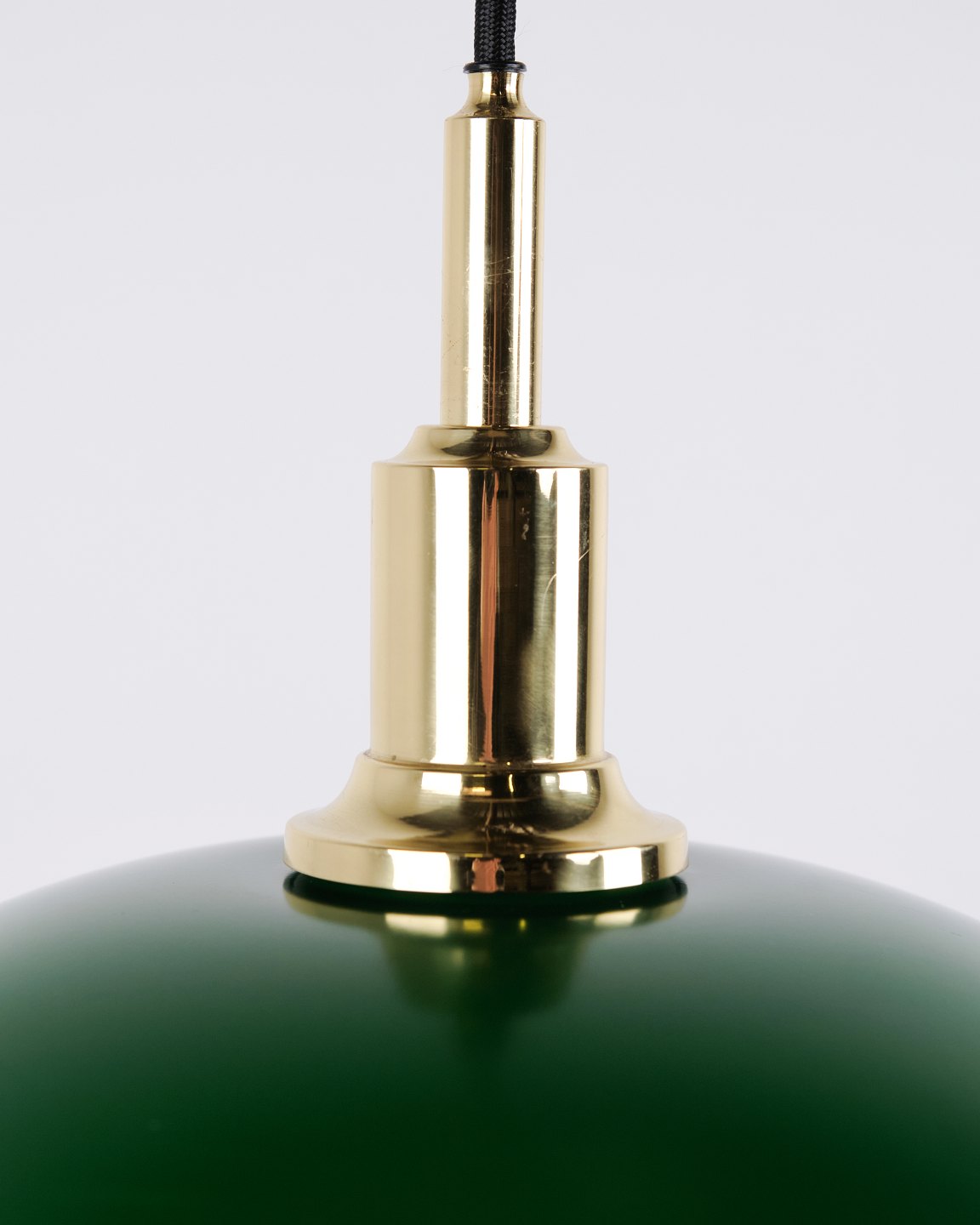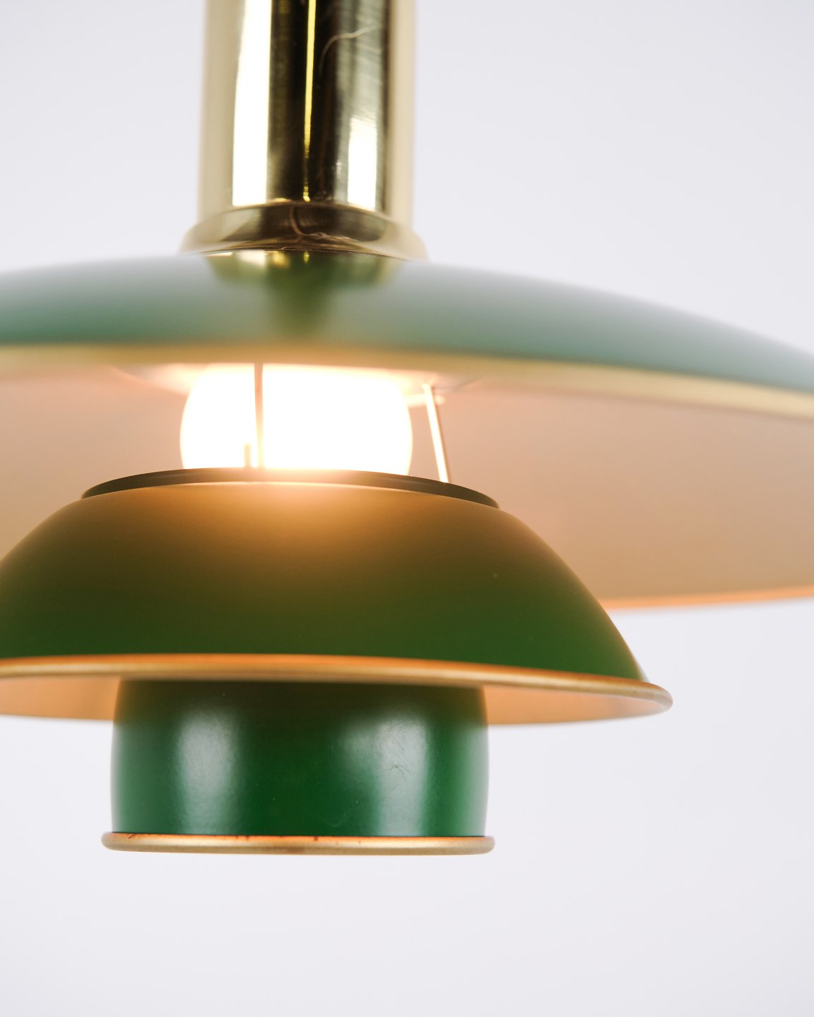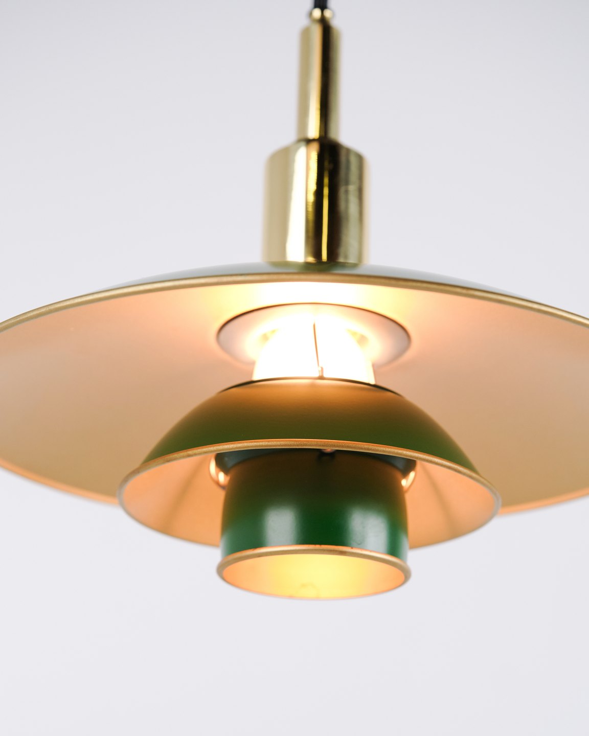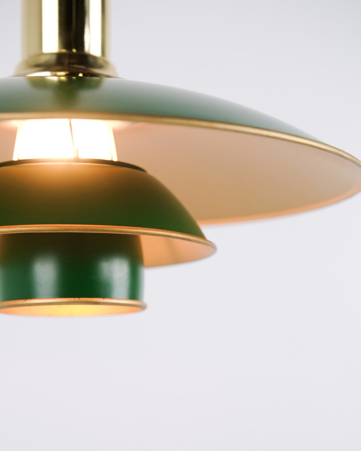 PH 3/2 Pendelleuchte, entworfen von Poul Henningsen und 1996 als Jubiläumsausgabe von Louis Poulsen herausgegeben. Die Leuchte ist aus Messing mit grünen Metallschirmen gefertigt, was dem Modell ein markantes und klassisches Erscheinungsbild verleiht. PH 3/2 gehört zu Poul Henningsens bekannten Dreischirmleuchten, entwickelt für blendfreies und angenehmes Licht. Die Jubiläumsausgabe wurde nur für einen begrenzten Zeitraum produziert und war auch in einer Variante mit roten Metallschirmen erhältlich.