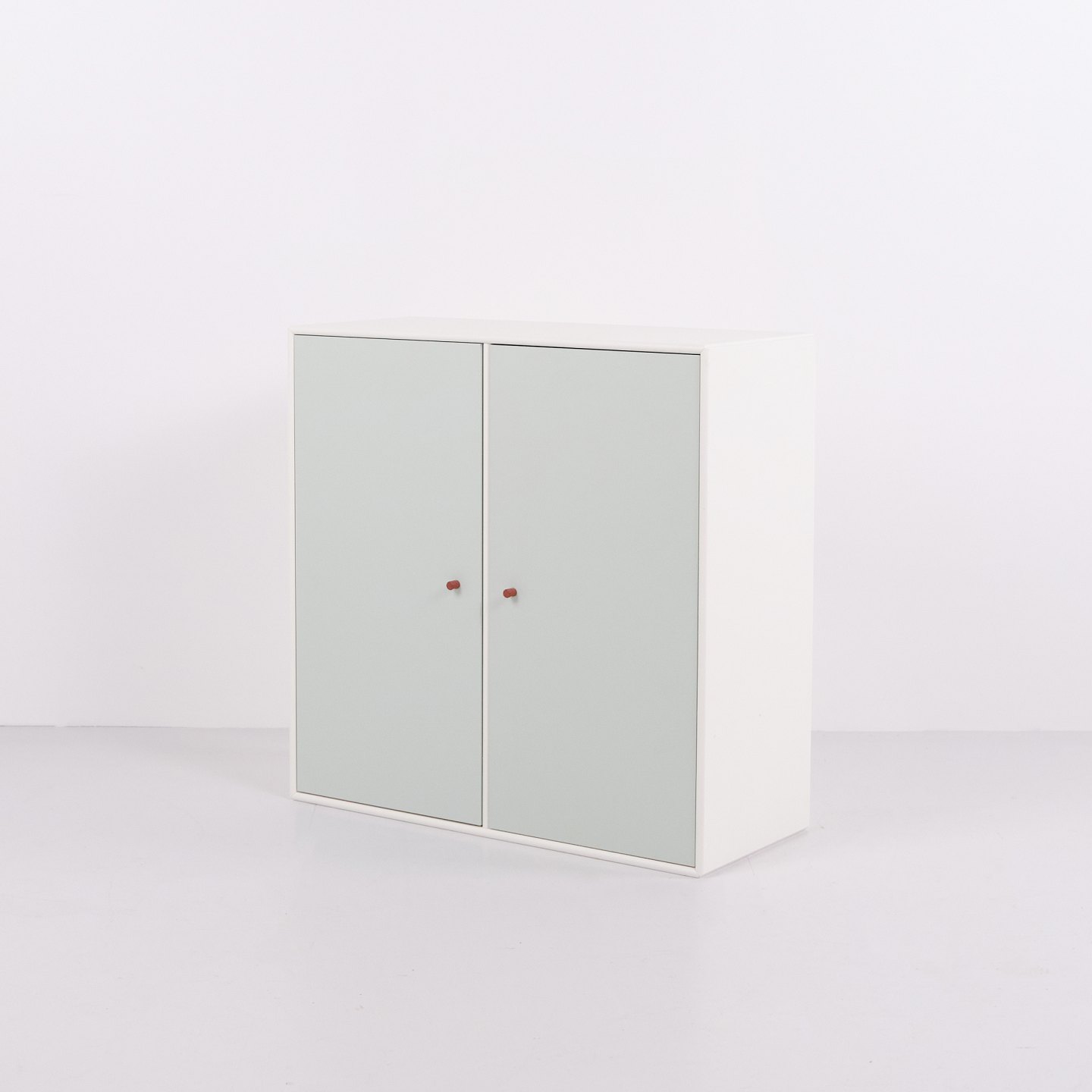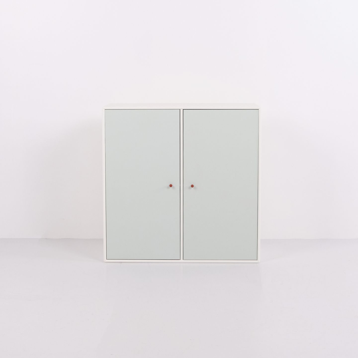 Montana Schrankmodul aus dem Montana System, entworfen von Peter J. Lassen für Montana. Aus lackiertem MDF mit weißem Korpus, zwei mintgrünen Türen und braunen Griffen. Geeignet als Wandschrank, Flurmöbel oder Aufbewahrungsmodul. 2 Stück auf Lager.
