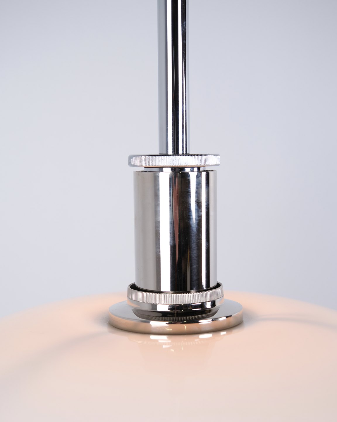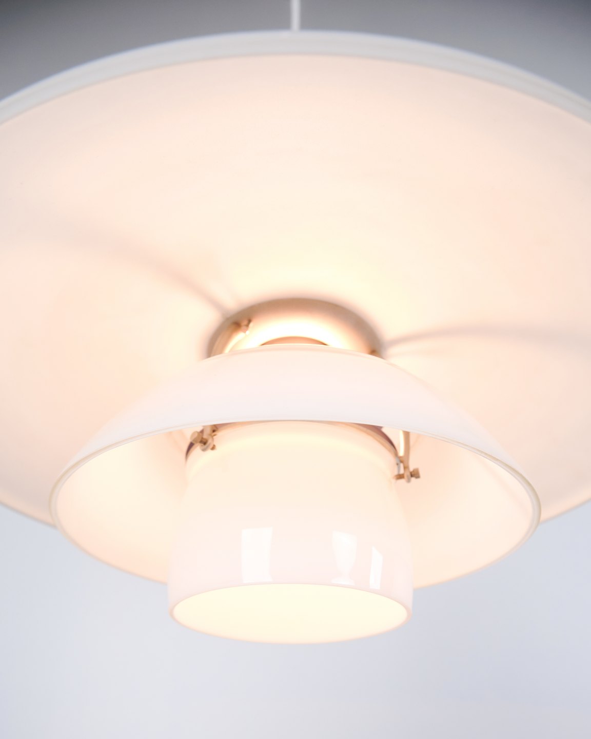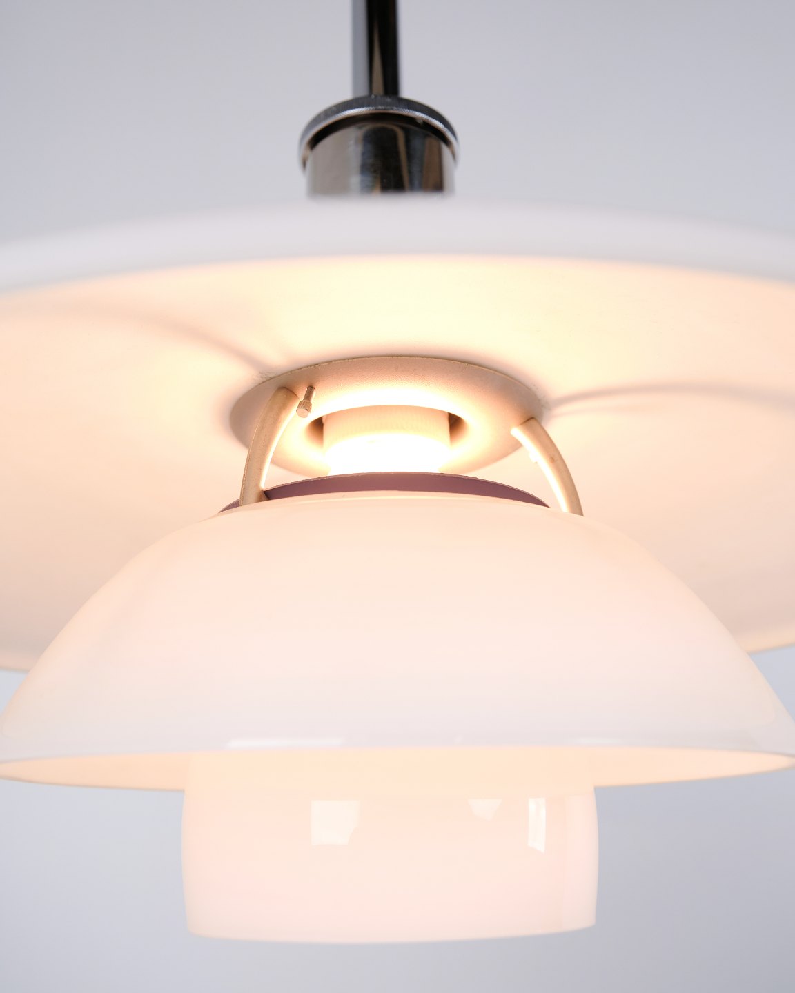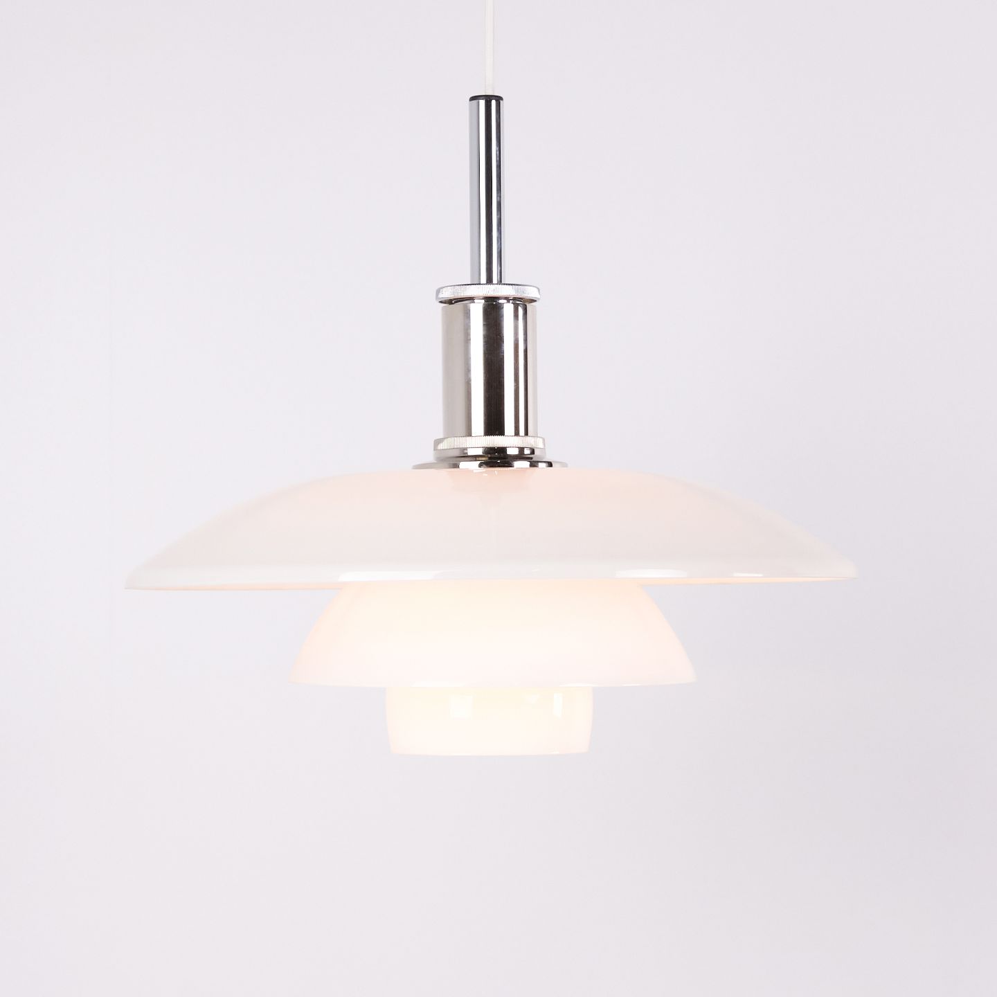 PH 4½-4 Pendelleuchte, entworfen von Poul Henningsen für Louis Poulsen. Die Leuchte ist mit mundgeblasenen Dreischirmen aus weißem Opalglas und Chromaufhängung gefertigt. Das Modell besitzt einen oberen Schirm von ca. 45 cm und verwendet die unteren Schirme der PH 4/4 Serie, entwickelt für eine breitere Lichtverteilung bei niedriger Aufhängung über Esstisch oder Tischfläche. Die heutige Version wurde 1980 eingeführt und ist Teil des ikonischen blendfreien PH Beleuchtungssystems.