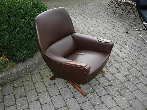Chair in brown leather with brazilian rosen wood on armrest designed by Illum Wikelsø