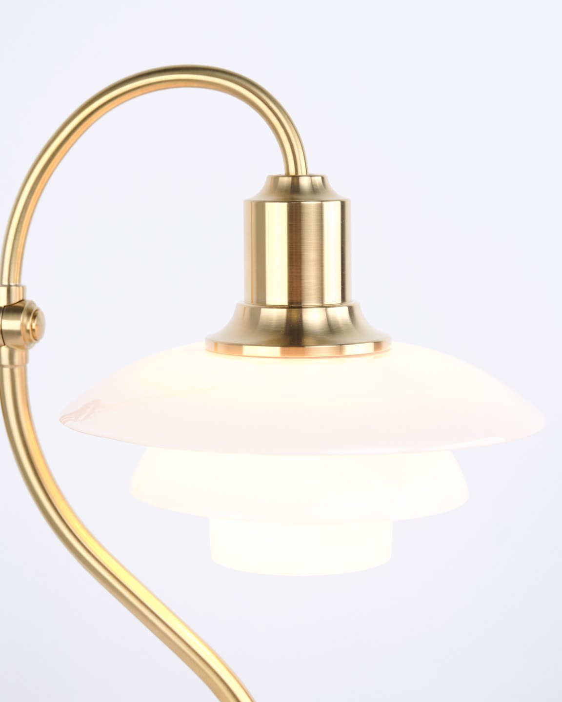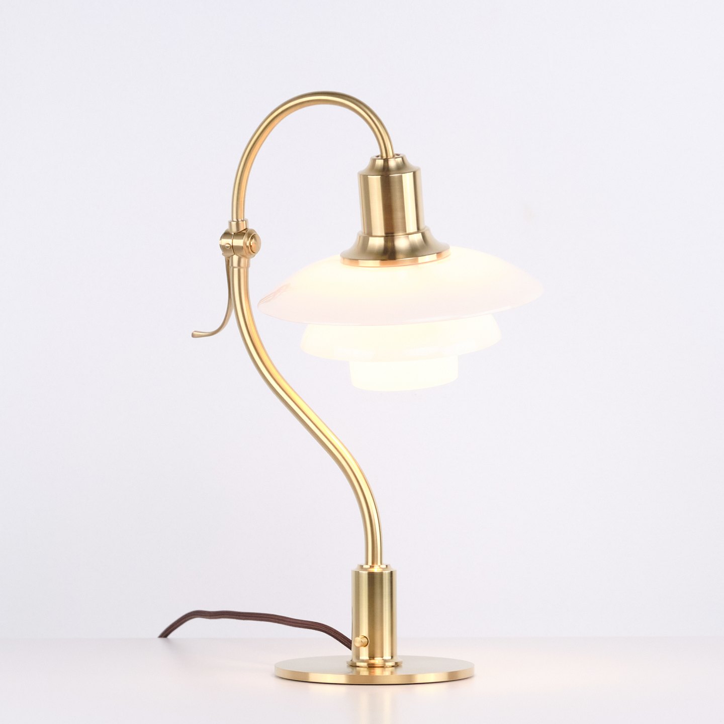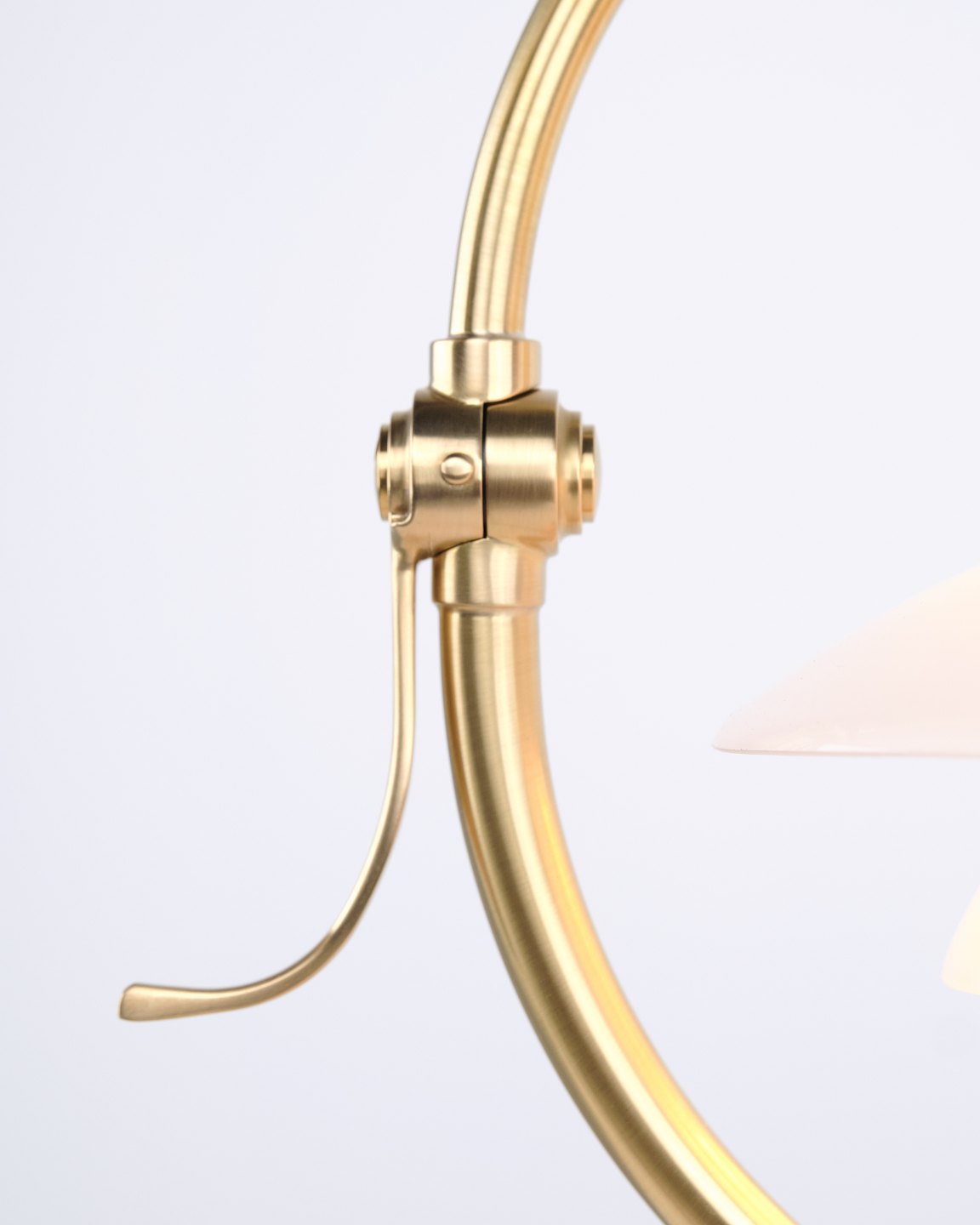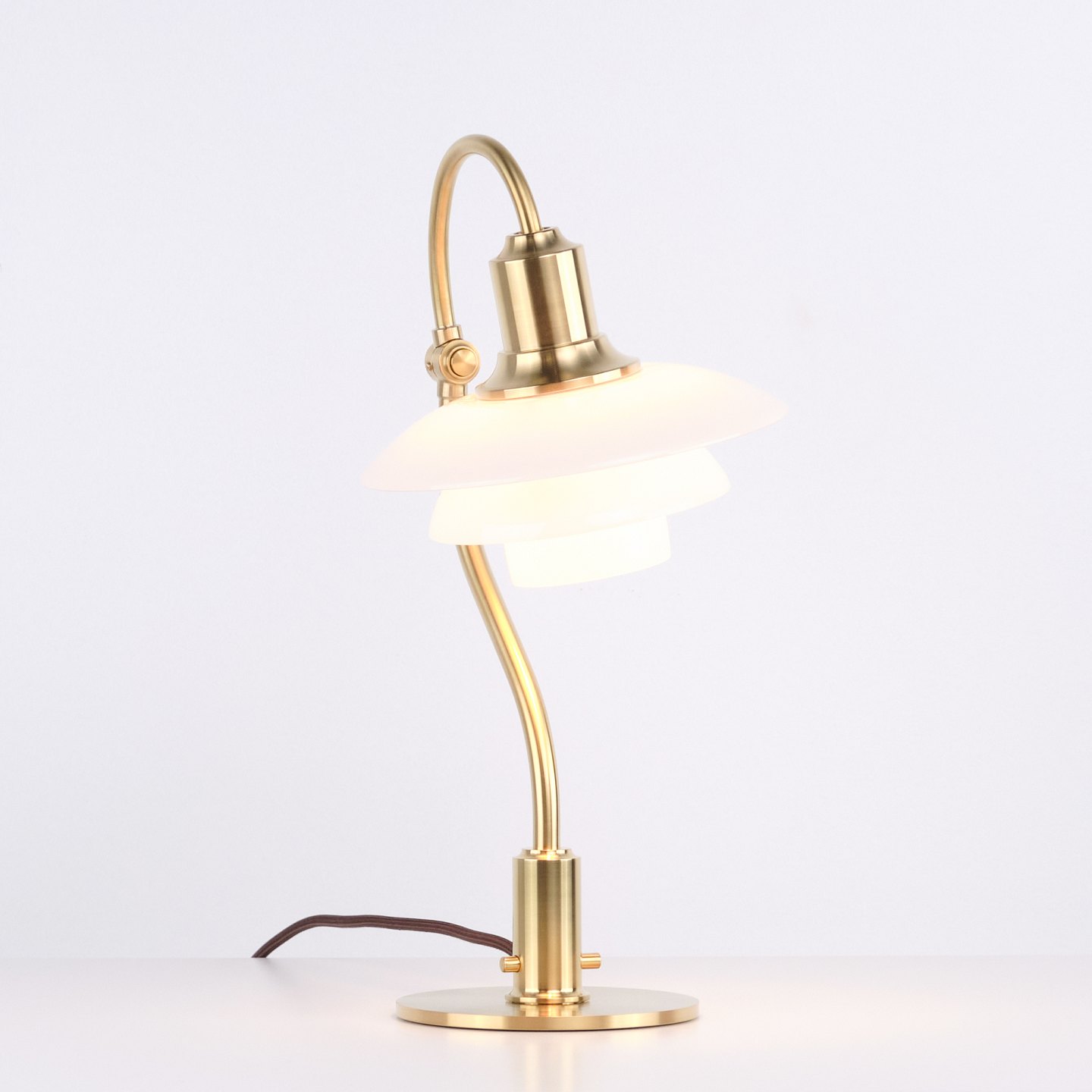 Exklusive PH 2/2 „Fragezeichen“ Tischlampe, entworfen von Poul Henningsen und 2021 als Limited Edition von Louis Poulsen herausgebracht. Die Lampe ist aus gebürstetem Messing gefertigt, mit Schirmen aus weißem Opalglas, und zeichnet sich durch ihre charakteristische geschwungene Form aus, die dem Modell seinen Namen gibt.