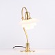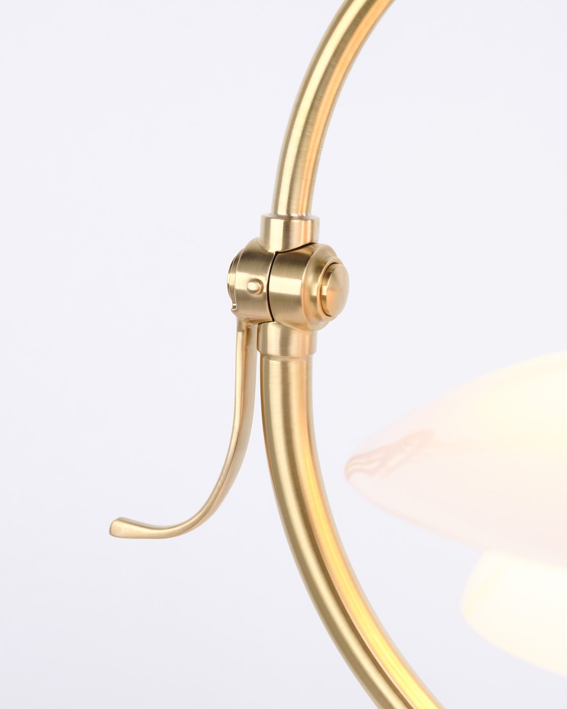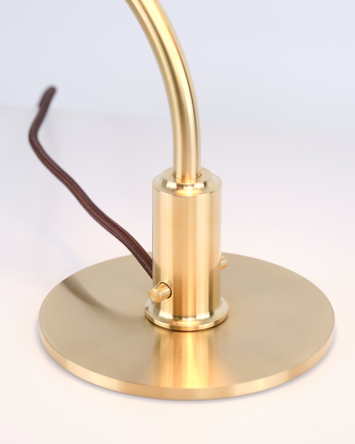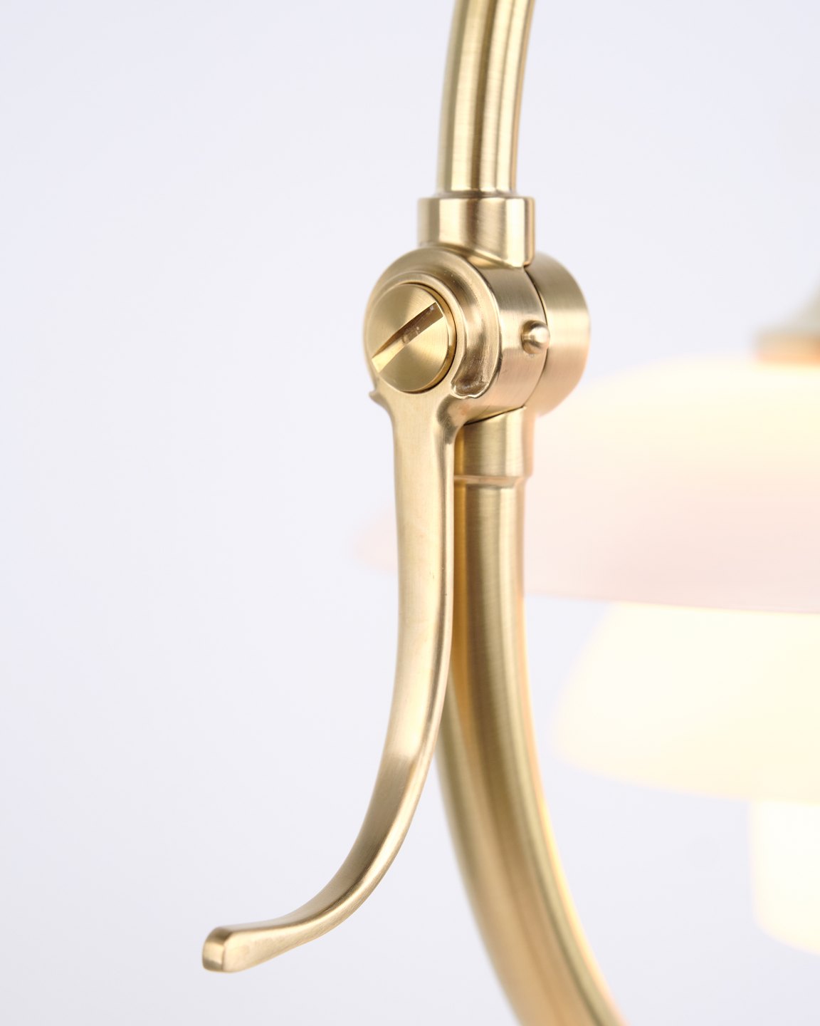 Exklusive PH 2/2 „Fragezeichen“ Tischlampe, entworfen von Poul Henningsen und 2021 als Limited Edition von Louis Poulsen herausgebracht. Die Lampe ist aus gebürstetem Messing gefertigt, mit Schirmen aus weißem Opalglas, und zeichnet sich durch ihre charakteristische geschwungene Form aus, die dem Modell seinen Namen gibt.