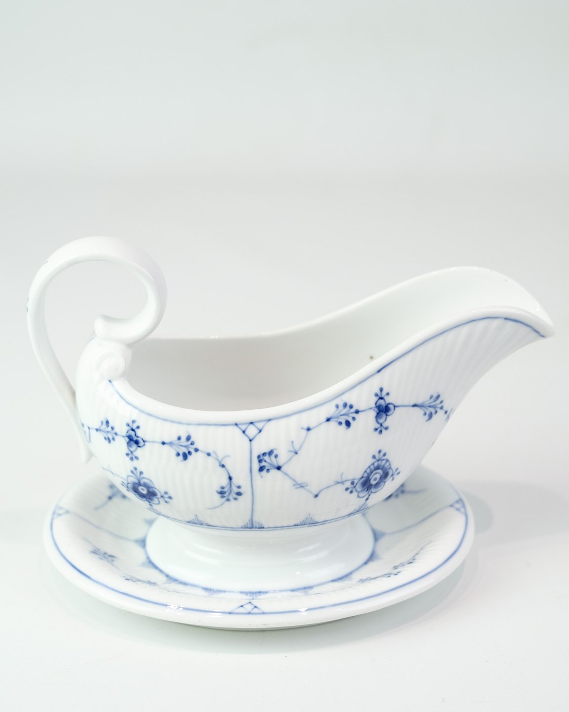 Classic sauce pot with matching saucer from Royal Copenhagen in the iconic blue fluting design. The model is No. 200 and made of hand-painted porcelain with cobalt blue decoration.