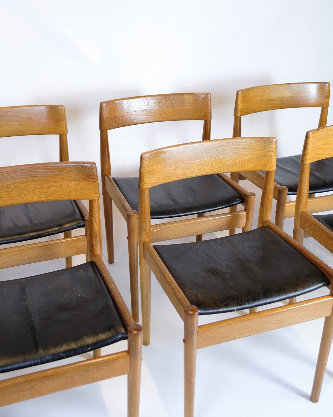 Set aus sechs Esszimmerstühlen aus Teak mit Sitzen aus original gepolstertem schwarzem Leder. Der Stuhl wurde von Grete Jalk entworfen und von Poul Jeppesen produziert. Das Modell erhielt die Nummer P J 3-2. Die Stühle stammen aus den 1960er-Jahren und befinden sich in gutem Zustand mit altersbedingter Patina an den Sitzflächen.