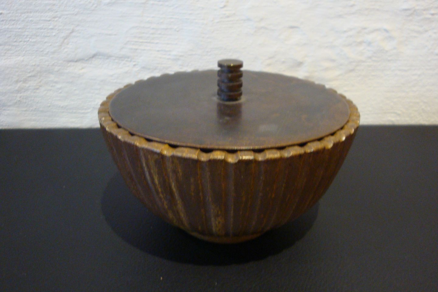SolgtLågkrukke med bronze låg af Arne Bang Højde 7 cm og 12 cm i dia.i perfekt stand 5000 m2 udstilling