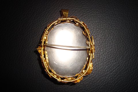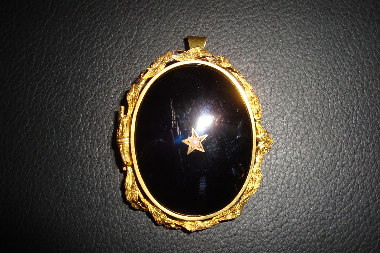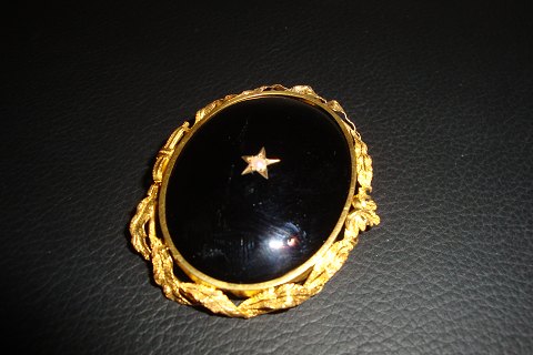 Solgtvedhæng / broche med sort indsats + lille kulturperle