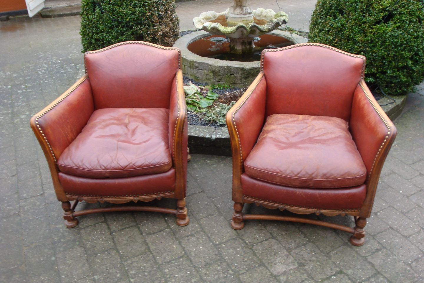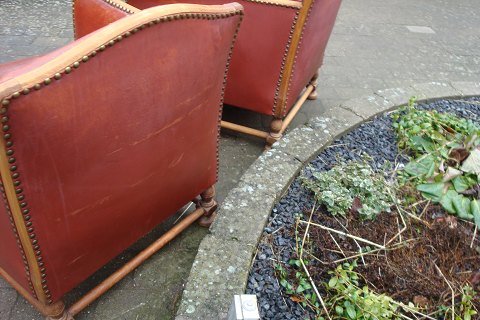A pair of easy chairs from around the year 1930, in patinated red leather.