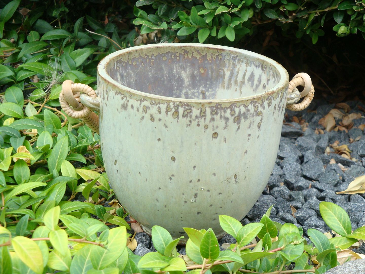SolgtKrukke i sandfarvede nuancer med flettet håndtag designet og signeret af Arne Bang nr 15.