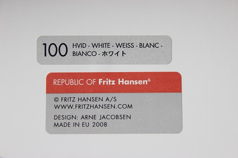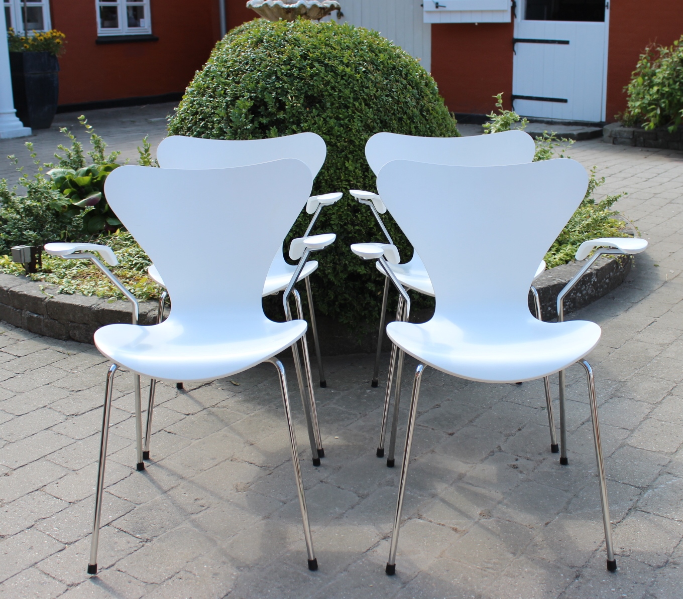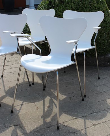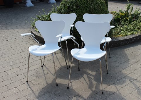 Solgt4 hvide syver stole, model 3107, med armlæn, designet af Arne Jacobsen og produceret af Fritz Hansen. Stolene er produceret i 2008, men designet i 1950erne.