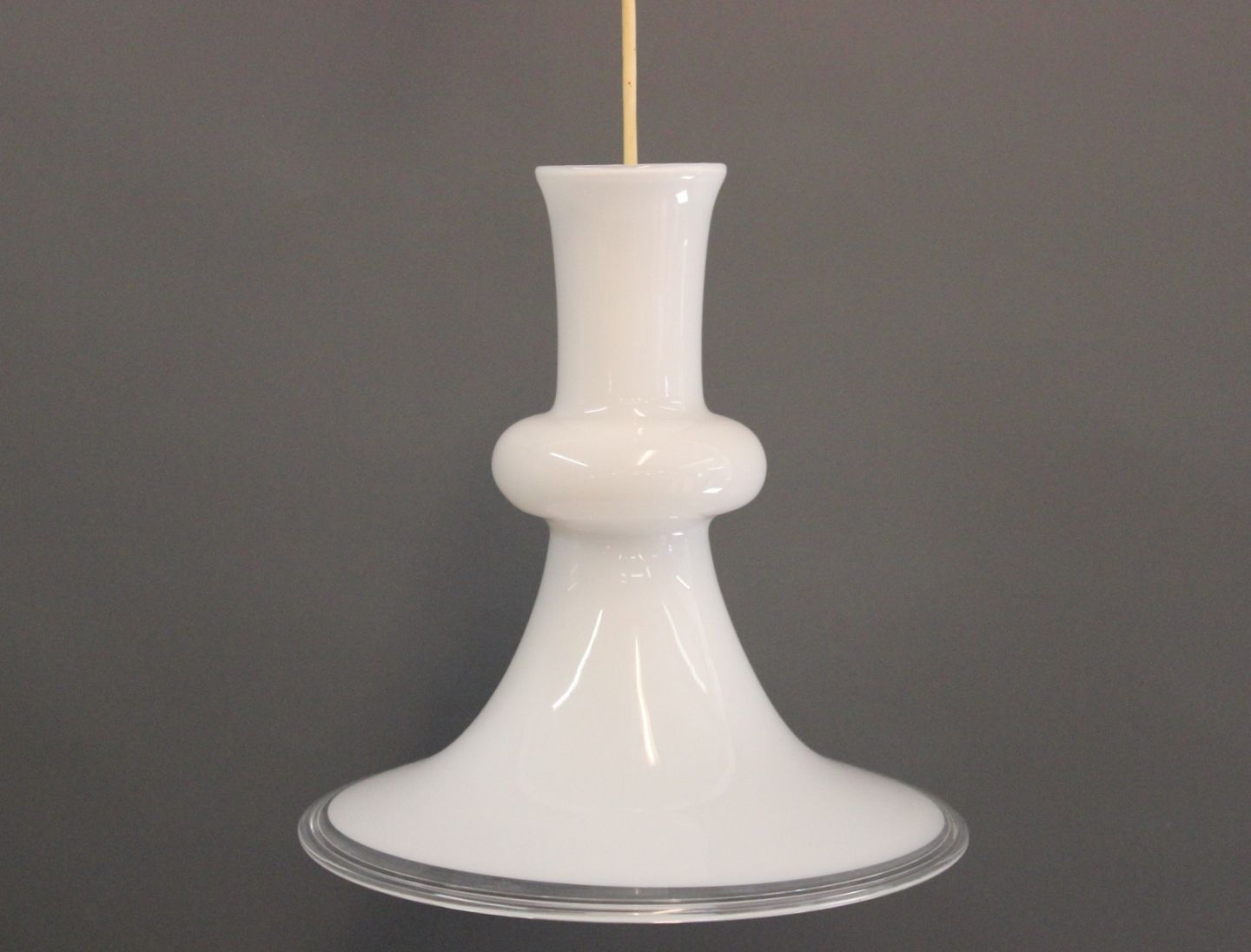 This lamp is one of the classics from Holmegaard, the lamp can easily be recognized by its clear glass edge on the bottom. In the middle of the lamp the glass has a "bubble". The model is made of mouth-blown opal glass, which gives a soft light. Because the lamp has been mouth-blown you won't find to lamps completely alike, which Means every lamp is Unique.