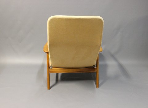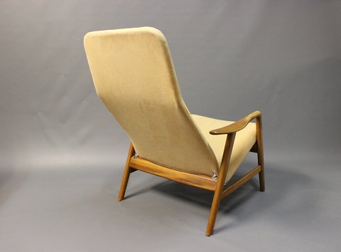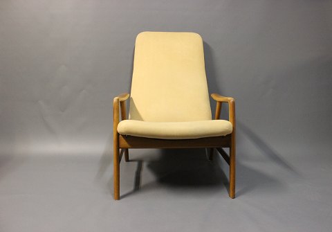 SoldHighback reclining lounge chair designed by Alf Svensson and manufactured by Fritz Hansen in 1957. The chair is in elm and upholstered with alcantara (suede).