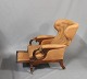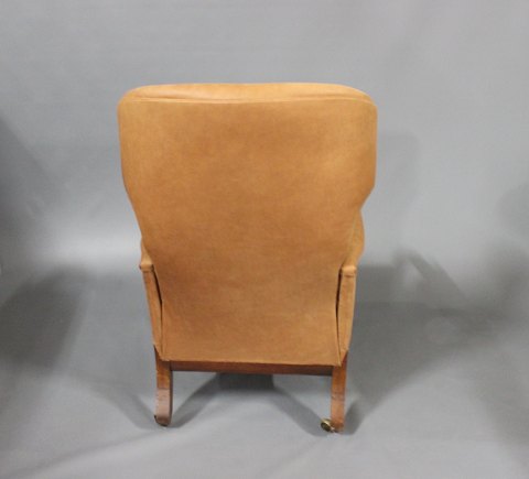 SolgtWilliam IV åben lænestol i palisander og læder med ryg som kan lægges ned og skydebar fodskammel af George Minter. Stolen er fra England og fra omkring 1830erne. Stolen kan lænes endnu mere tilbage.