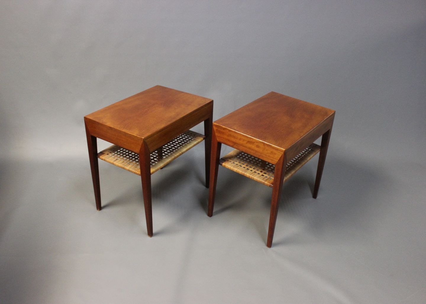 SoldA pair of sidetables designed by Severin Hansen for Haslev Furniture Factory in the 1960s. The tables are in mahogany and cane beneath.