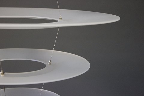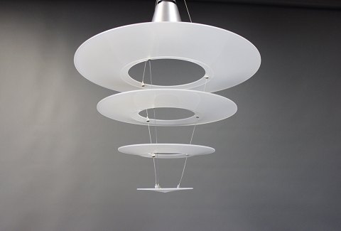 SoldEnigma 425 pendant designed by Shoichi Uchiyama and manufactured by Louis Poulsen. The pendant is in brushed aluminum and matted acrylic.