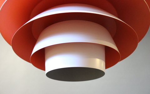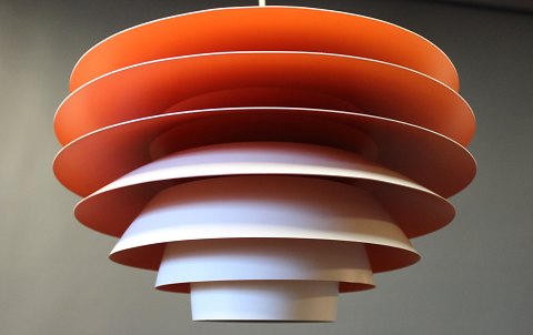 SoldVerona pendant designed by Svend Middelboe and manufactured by Fog and Mørup in the 1970s. The pendant in White laqcuered aluminum and orange on the inside.