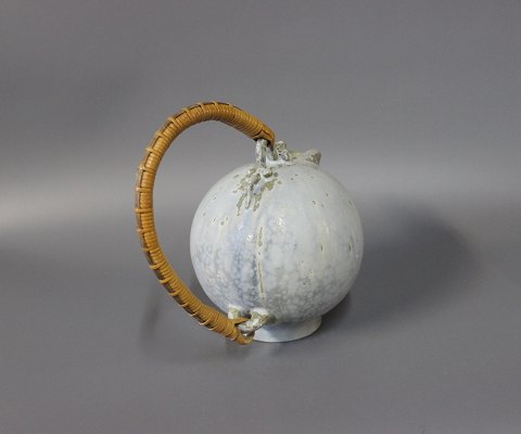 Ceramic jug in light colors with a paper cord handle by Arne Bang.