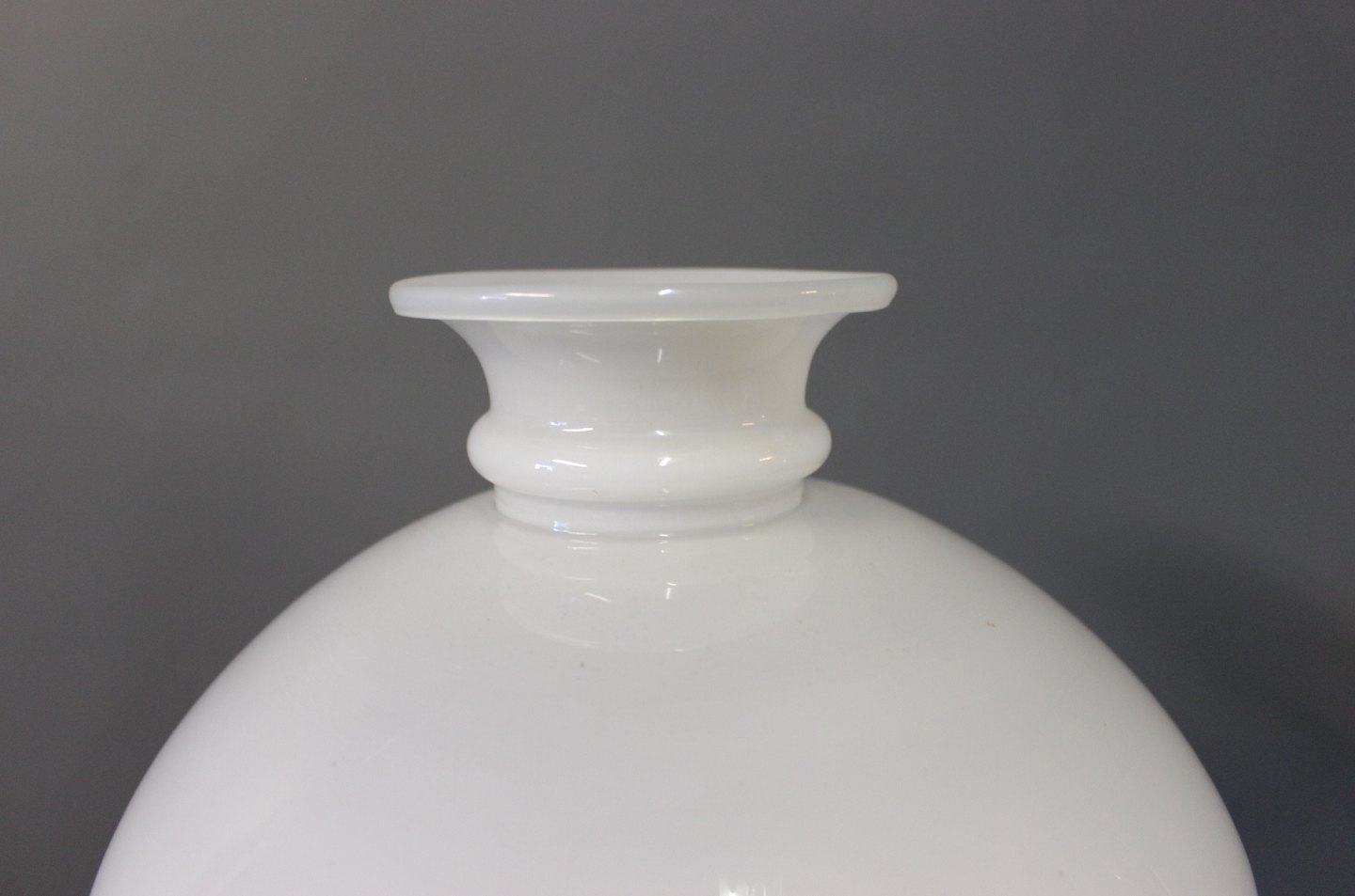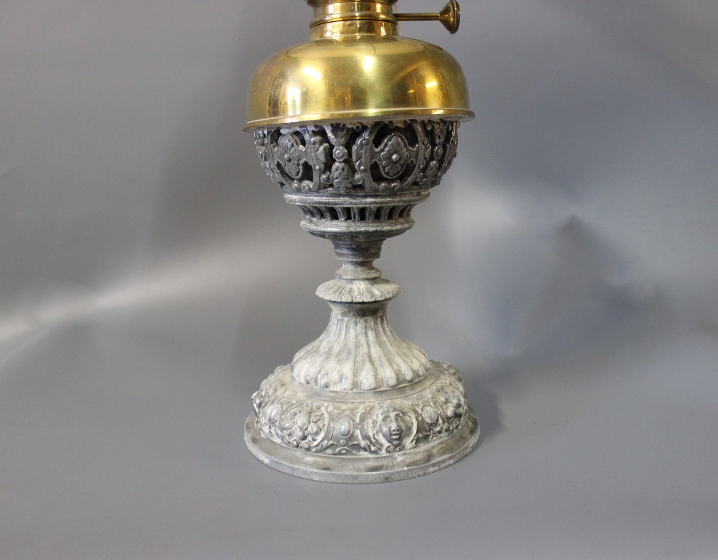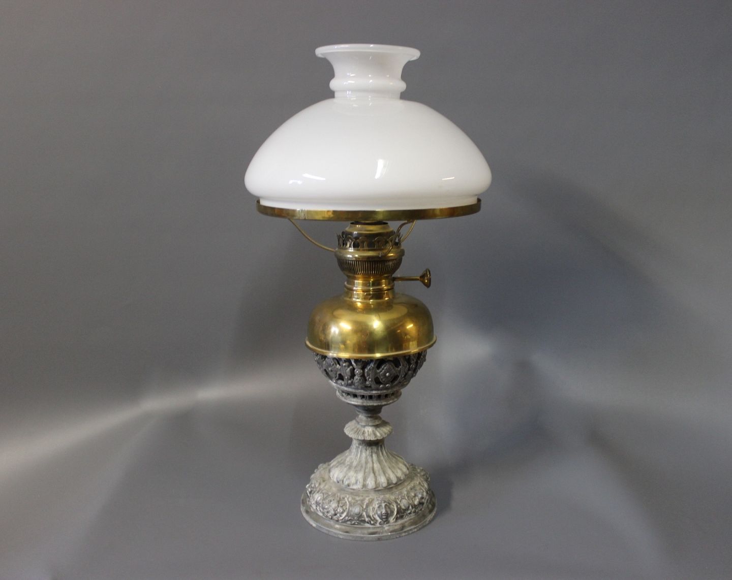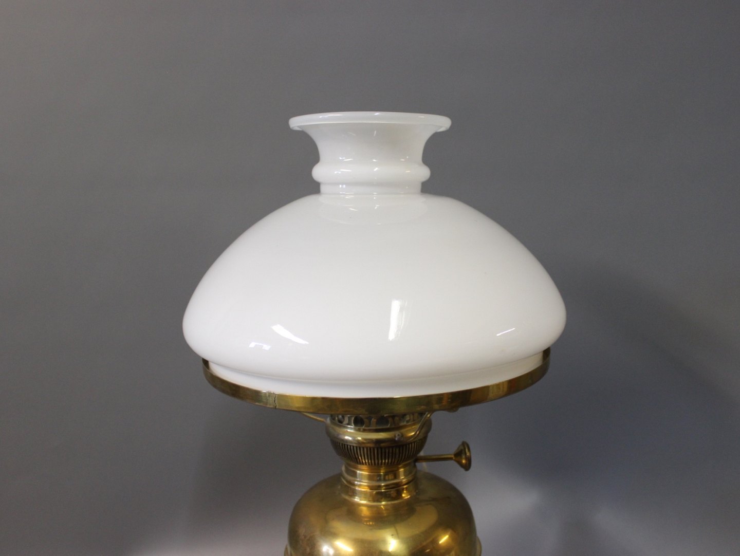 SoldKerosene table lamp with an iron/brass foot and White glass dome.