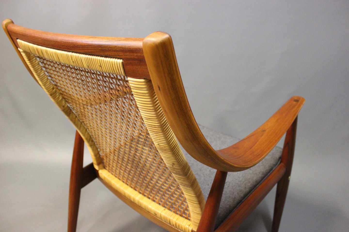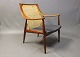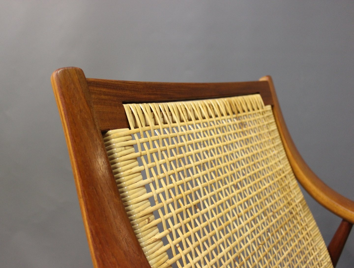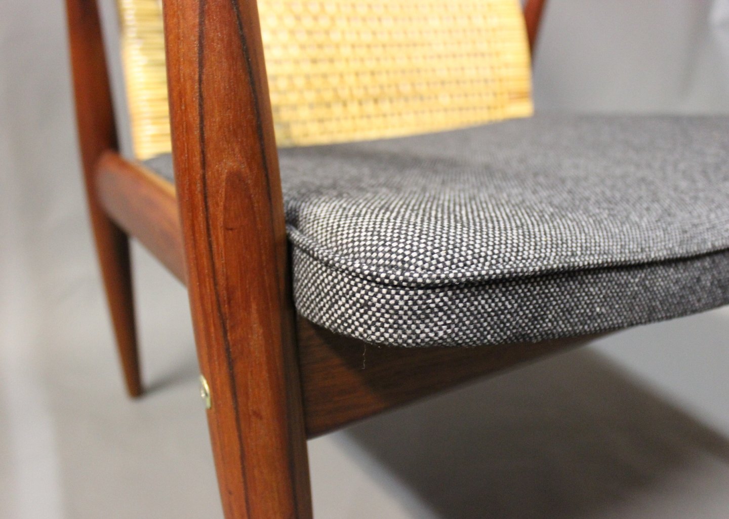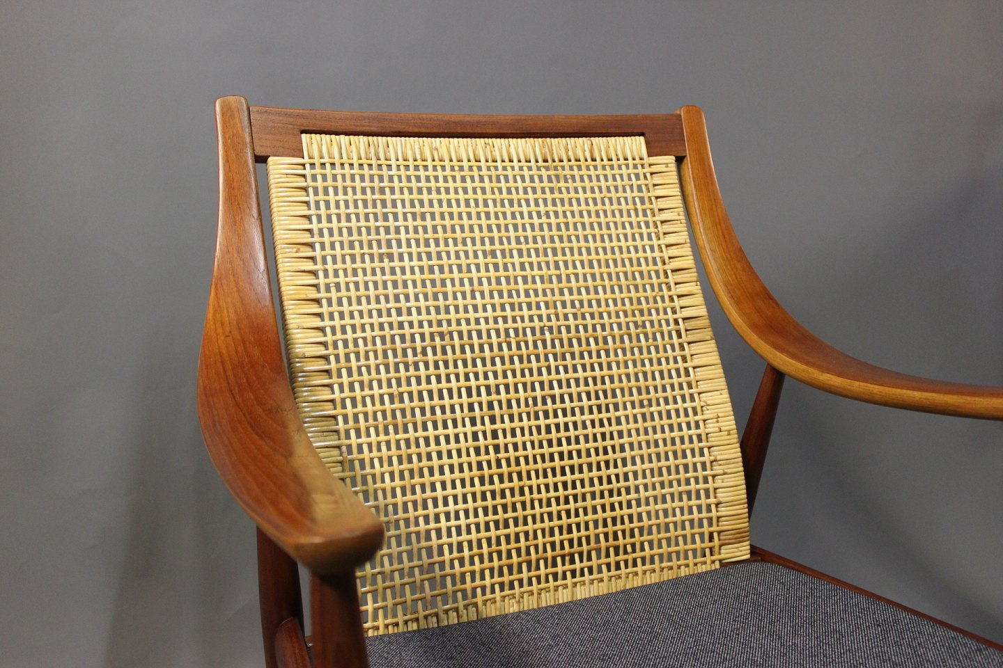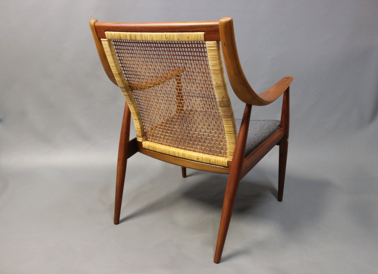 SolgtLænestol designet af Orla Mølgaard-Nielsen og Peter Hvidt. Stolen er i teak med flet ryg og ny polstret gråt sæde, hallingdal, af dansk design fra 1960erne.