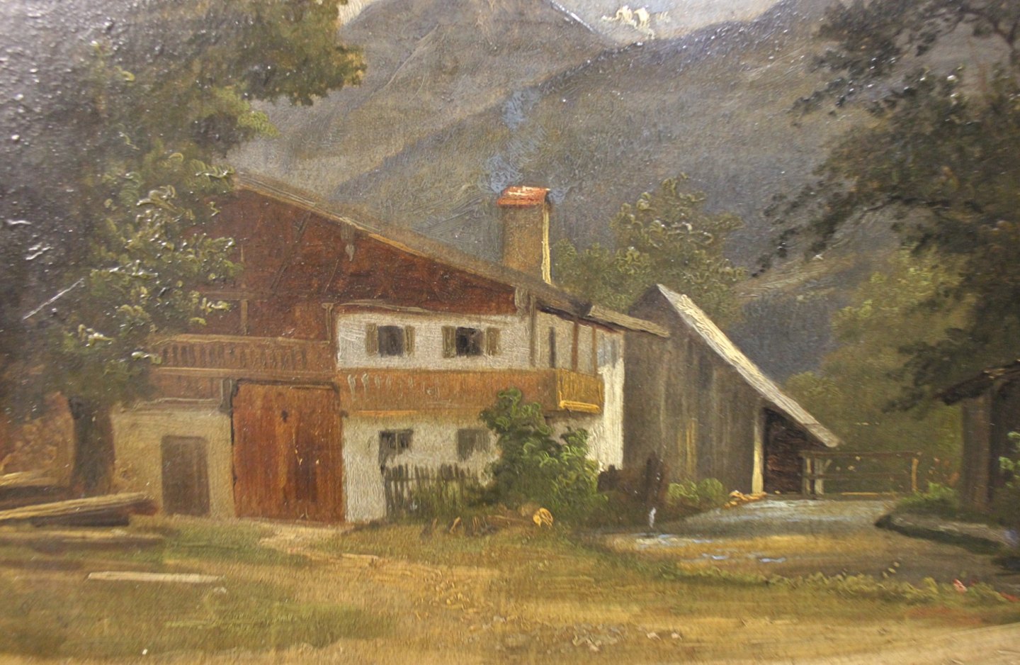 Oil painting of house in the Mountains signed A. Paul with wooden frame decorated with gold leaf.