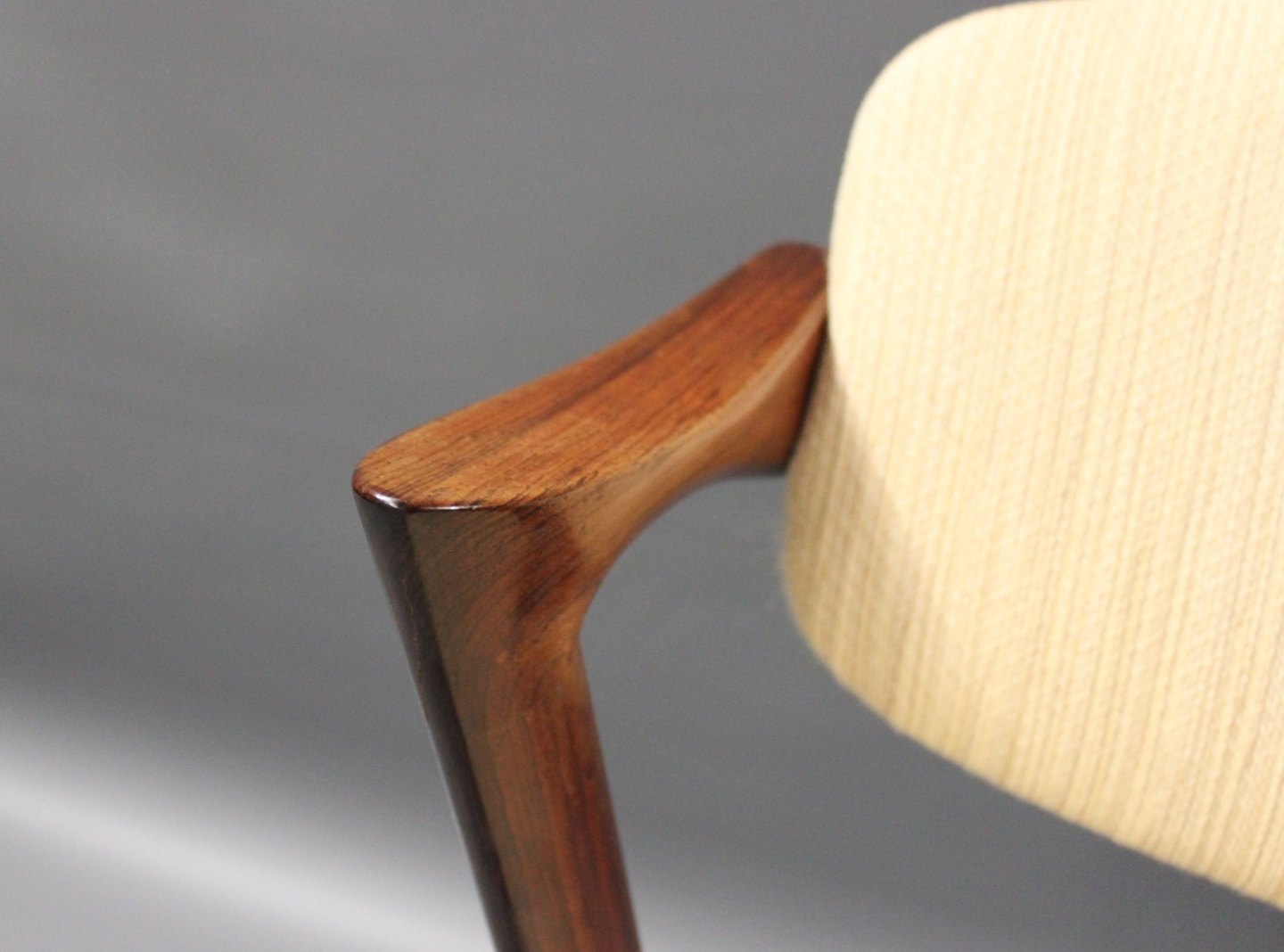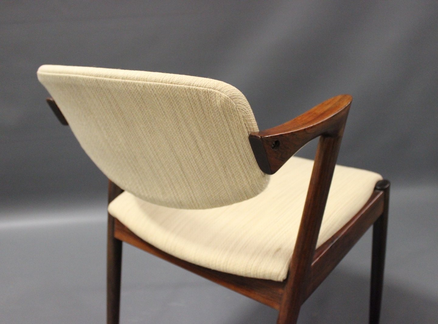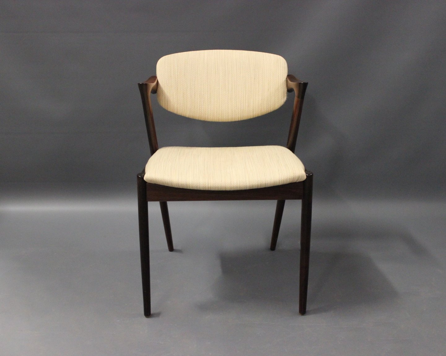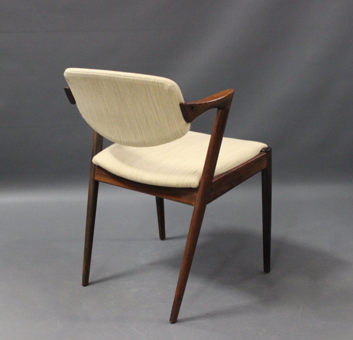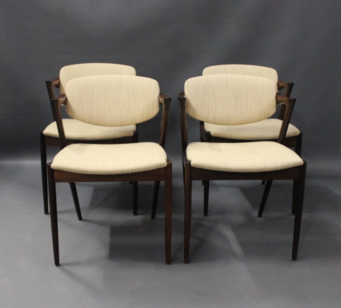 A set of four dining room chairs, model 42, designed by Kai Kristiansen and manufactured at Schou Andersen in the 1960s. The chairs are of rosewood and with light upholstery.