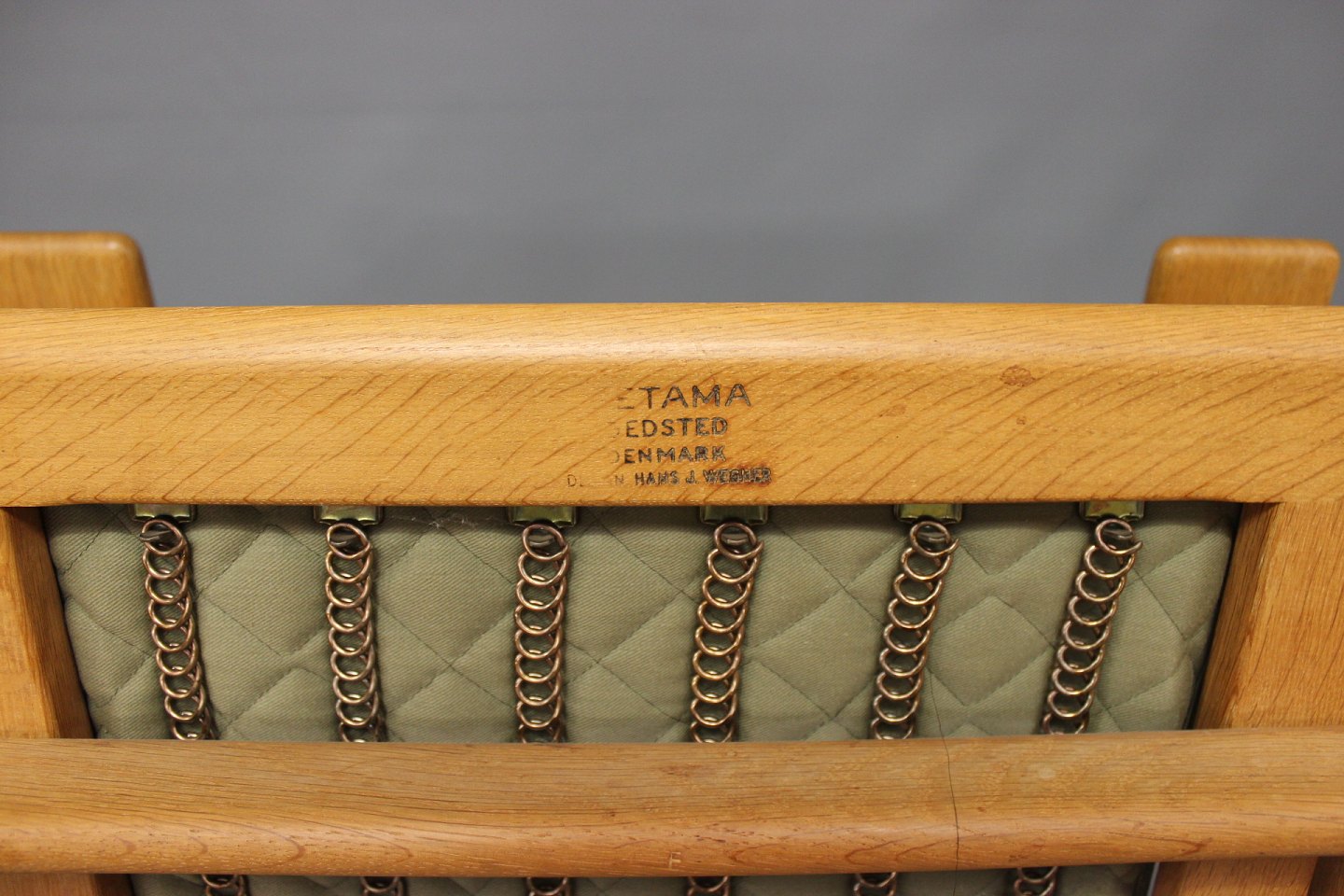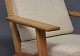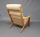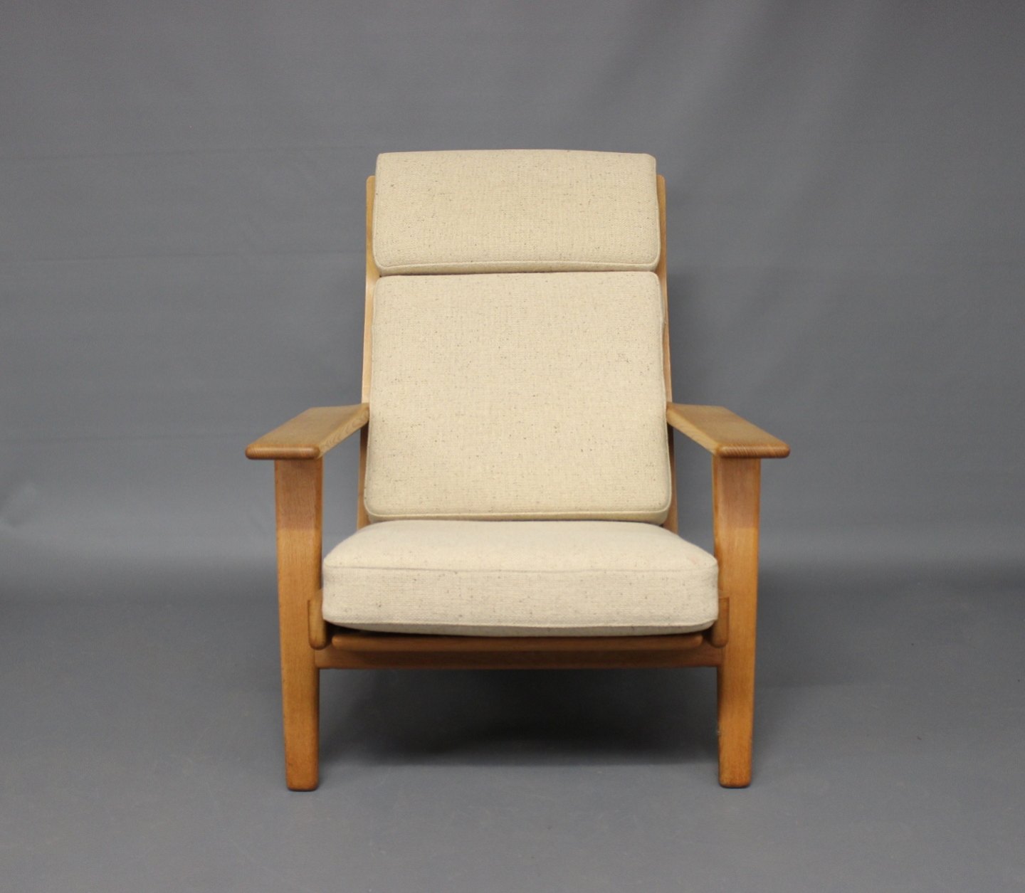 Armchair with high back, model GE290A, designed by Hans J. Wegner in the 1950s and manufactured by GETAMA in the 1960s. The chair is made of oak and cushions in light hallingdal wool.