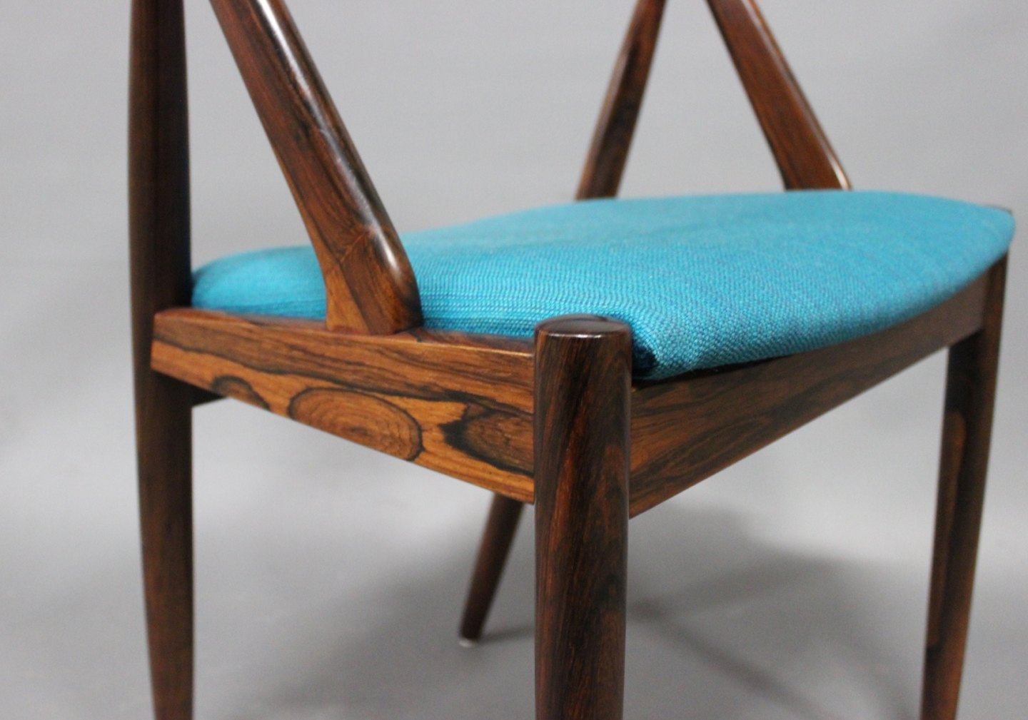 SoldA set of six dining room chairs, model 31, designed by Kai Kristiansen in 1956 and manufactured by Schou Andersen in the 1960s. The chairs are in rosewood and upholstered in blue fabric.
