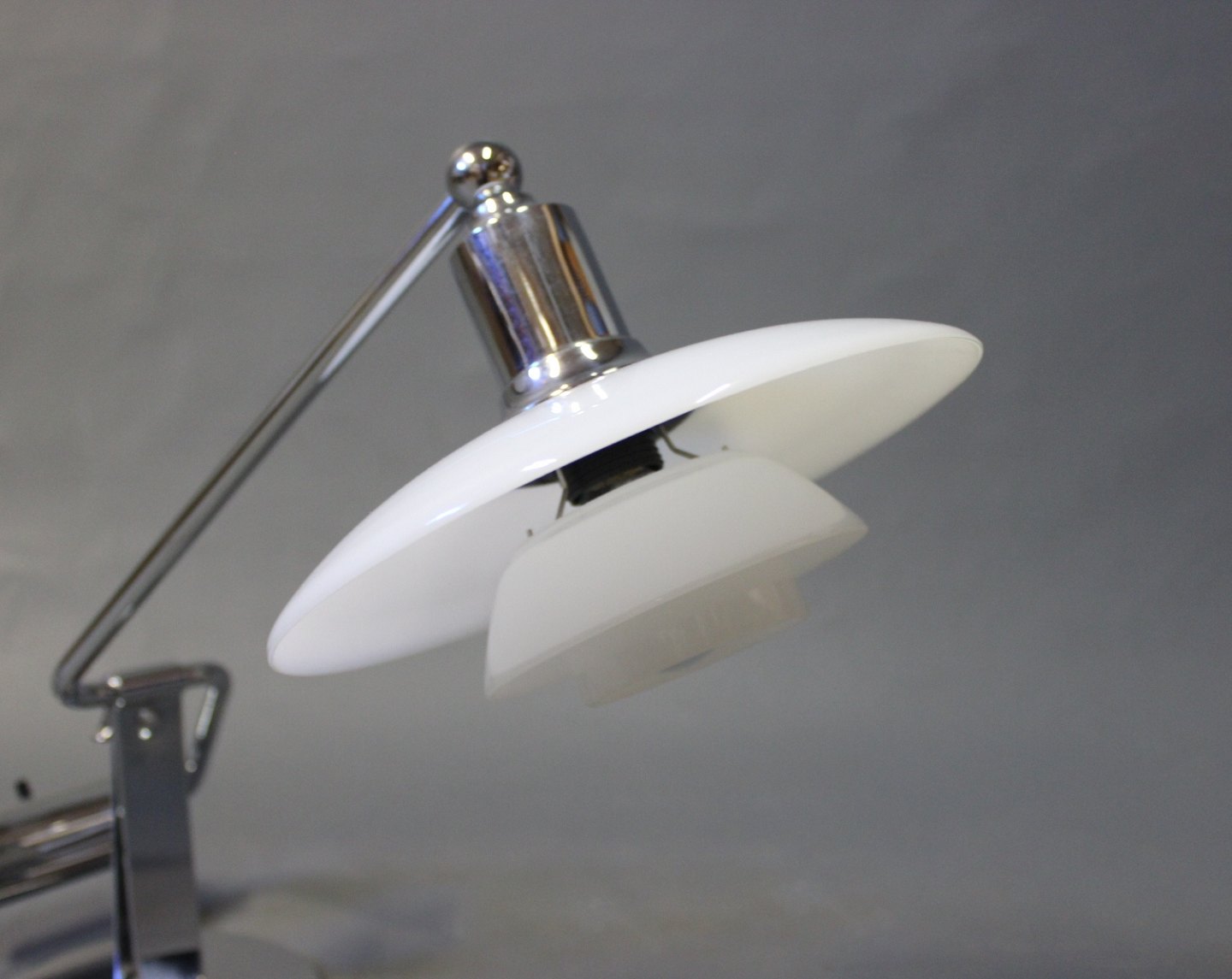 SoldPiano lamp PH 2/1 designed by Poul Henningsen in 1943 and manufactured by Louis Poulsen in the 1980s. The Shades are of White opaline glass and the frame of chrome plated metal.
