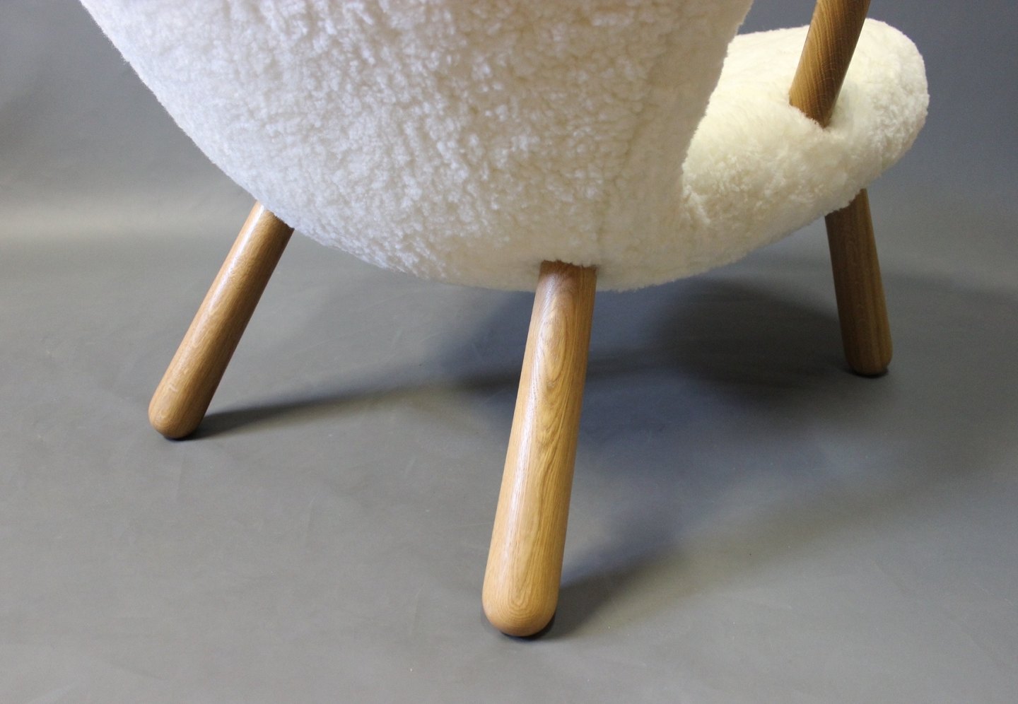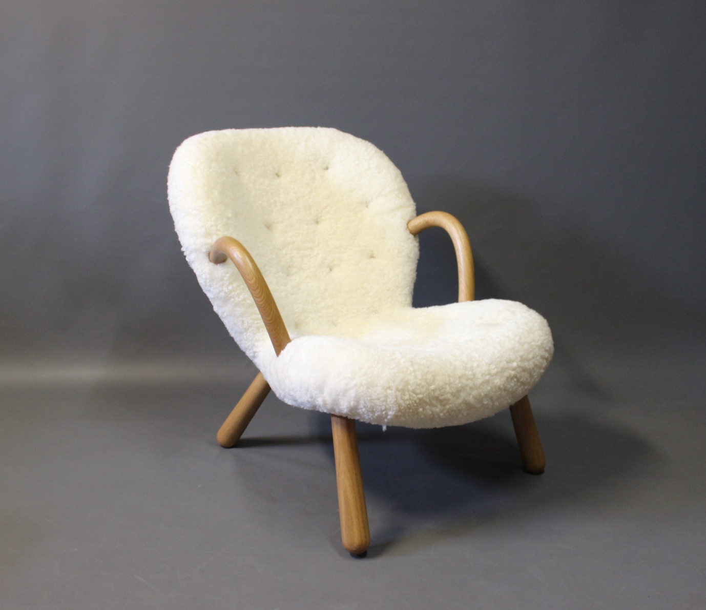 Sold"The Clam Chair" originally designed by Phillip Arctander in 1944 and manufactured by Paustian in 2016. The chair is upholstered in sheep skin and with amrs and legs og oak.