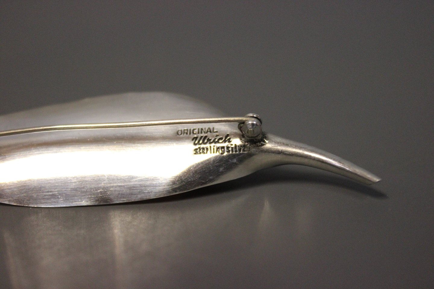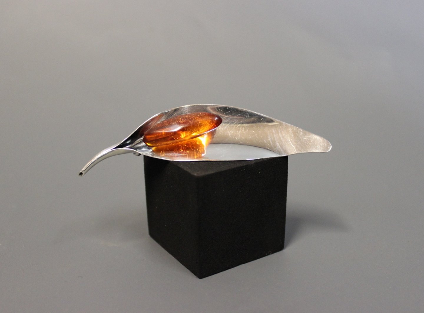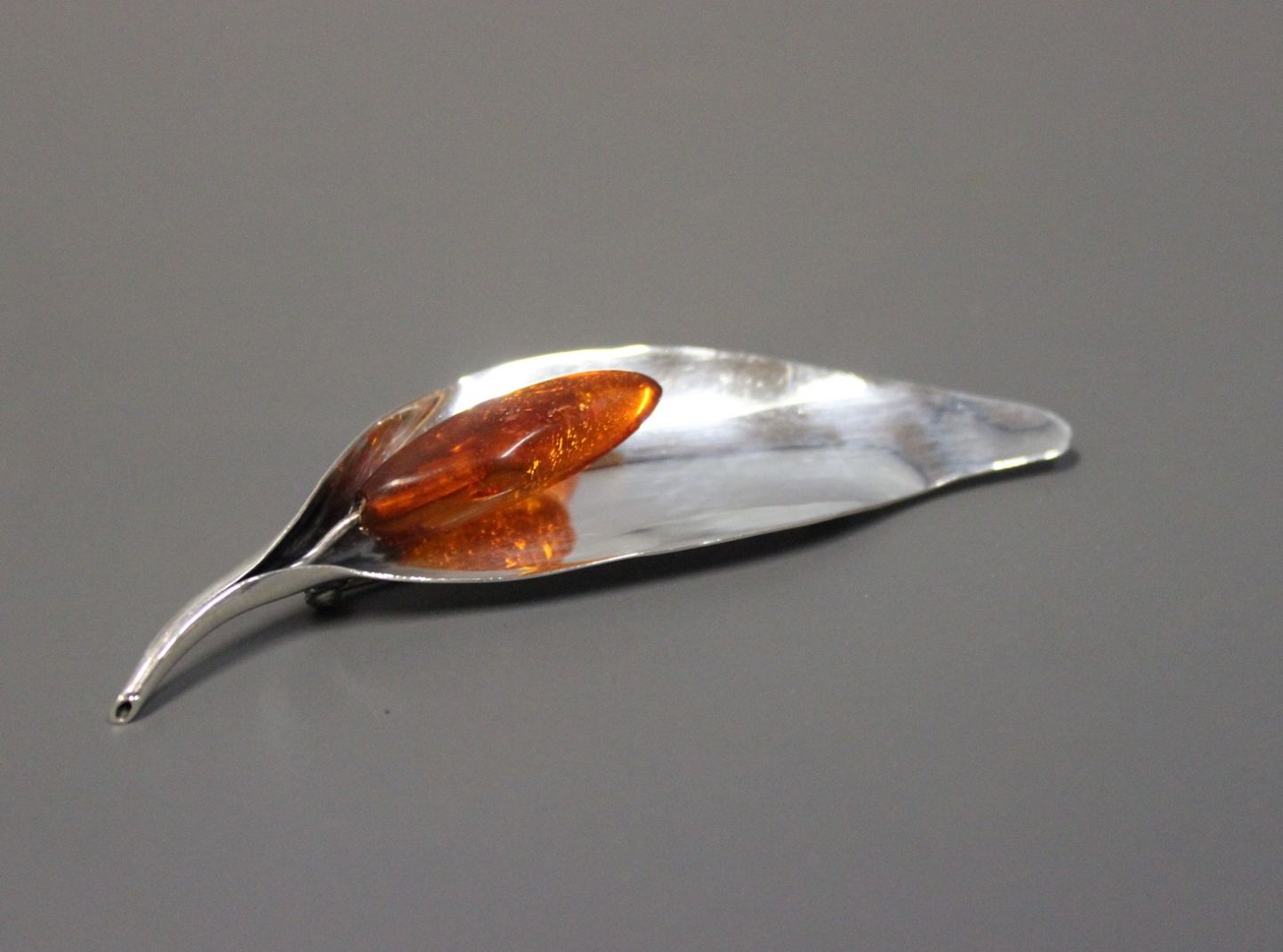 SoldBrooch shaped as a leaf with a piece opf amber stamped Original Ulrich in 925 sterling silver.