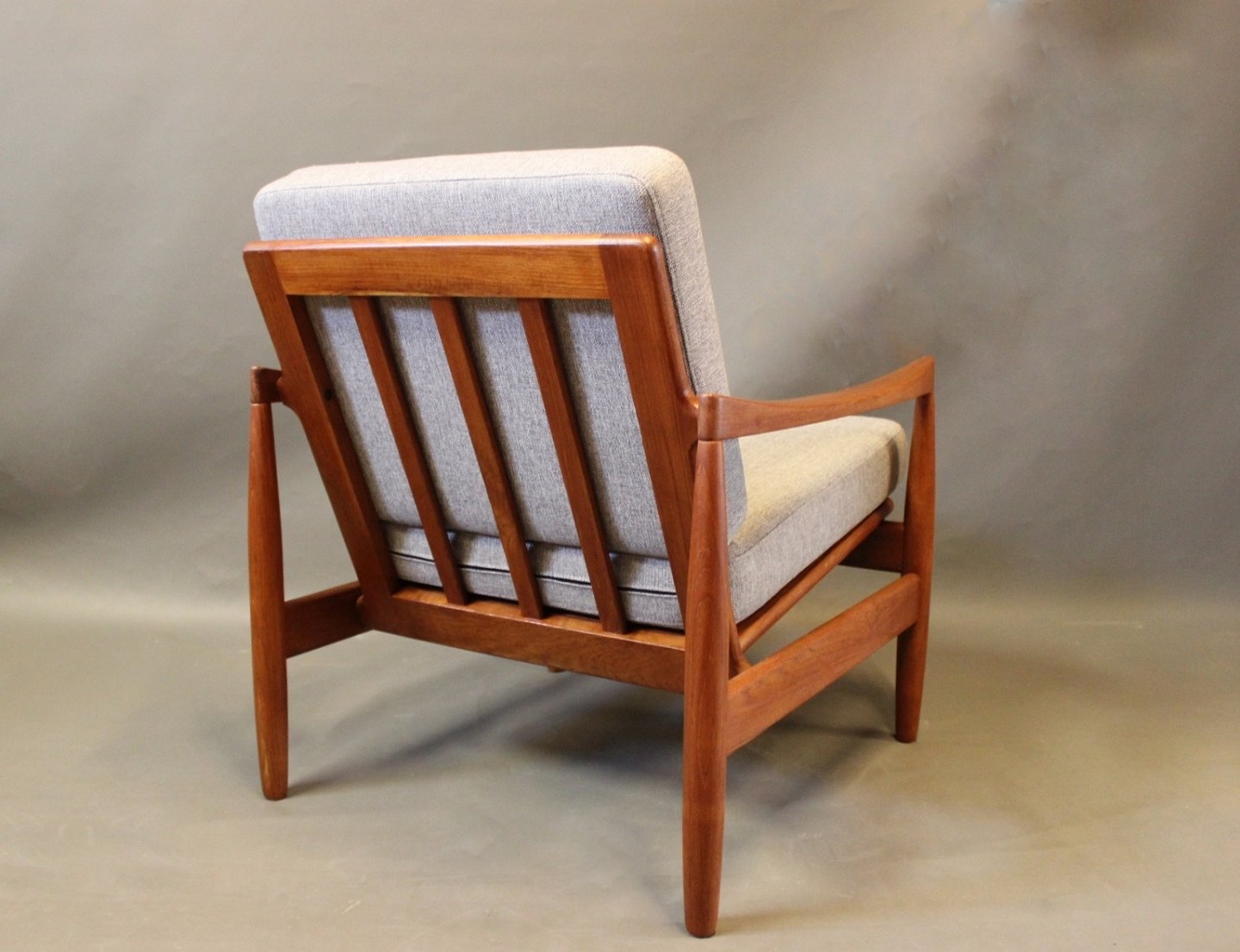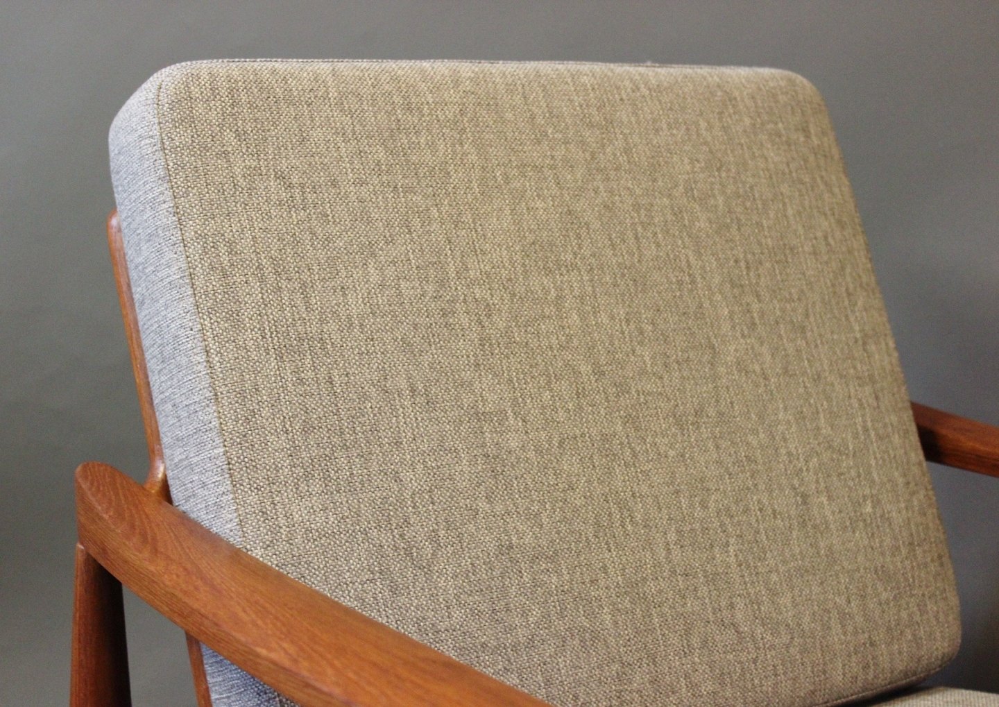 SolgtEt sæt lænestole i teak og hynder af lysegråt uld designet af Kai Kristiansen og fremstillet af Skive Møbelfabrik. Stolene er fra 1960erne og hynderne er nypolstret.