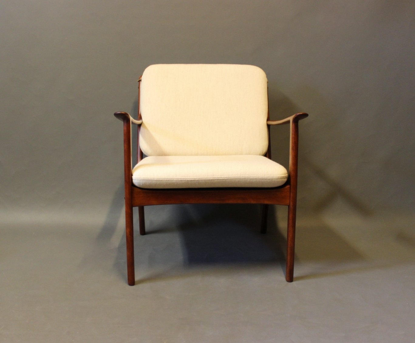 SoldPJ112 easy chair in polished mahogany and with cushions in light wool, designed by Ole Wanscher and manufactured by P. Jeppesen.