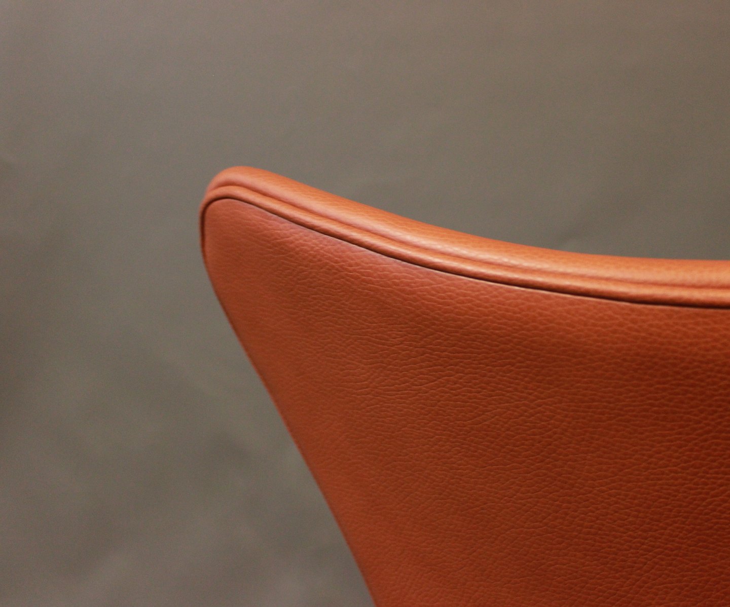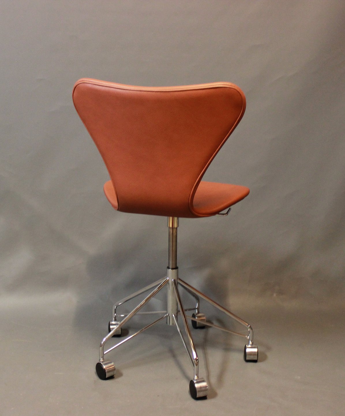 SoldSeven office chair, model 3117, in classic cognac colored leather designed by Arne Jacobsen and manufactured by Fritz Hansen in 2017. We have more in stock.