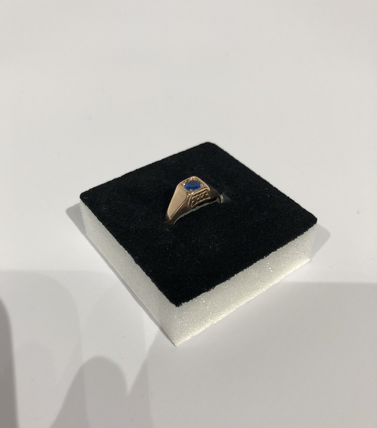Lille ring i 14 kt. guld med enkel blå sten, stemplet KJa.