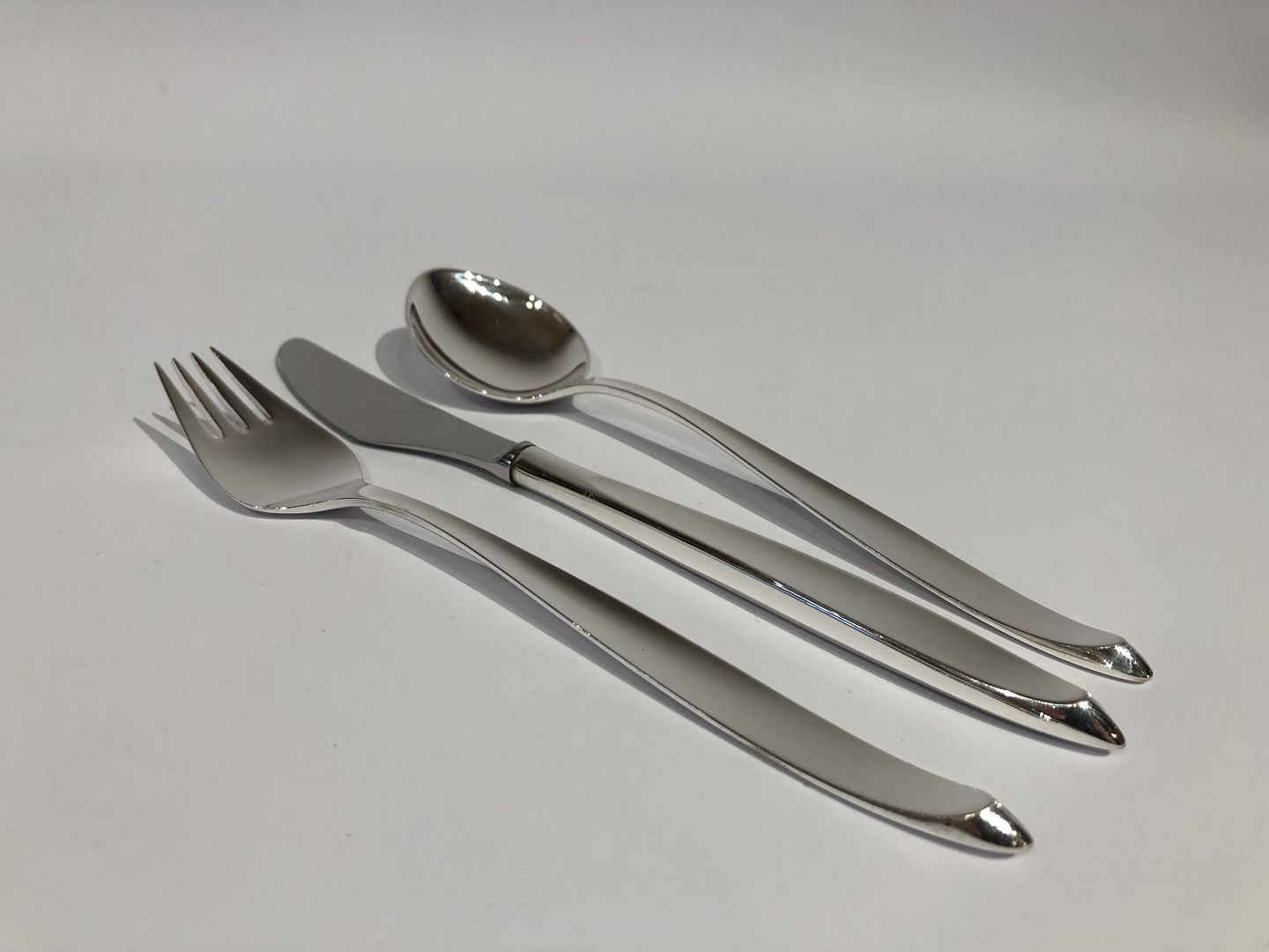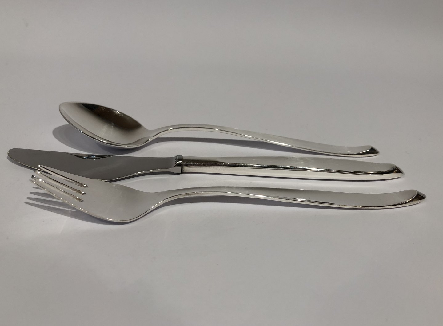 Barnebestik bestående af gaffel, kniv og ske i tretårnet sølv.