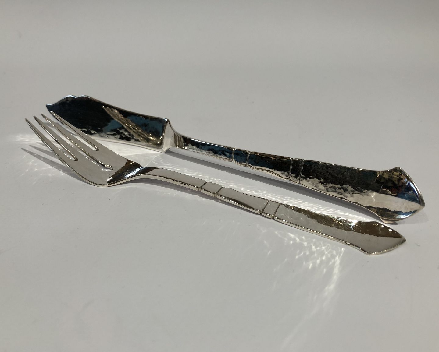 Fish cutlery in hammered hallmarked silver. Ask for number in stock.