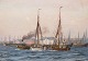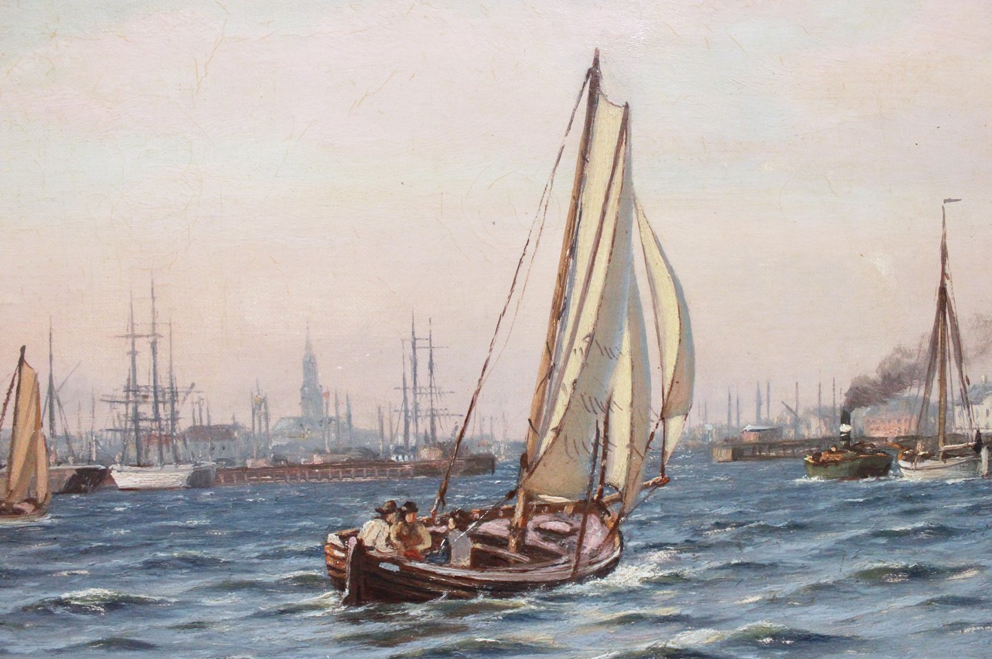 Marine painting with Copenhagen's towers in the background by Johan Neumann.
