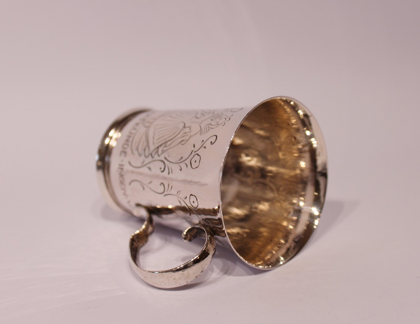 SolgtBørnekrus med tekst fra Prinsessen på Ærten fra 1929 i tretårnet sølv stemplet EN af Evald Nielsen. Kruset er dekoreret med teksten "Saa ømskindet kunde ingen være uden en virkelig prinsesse".