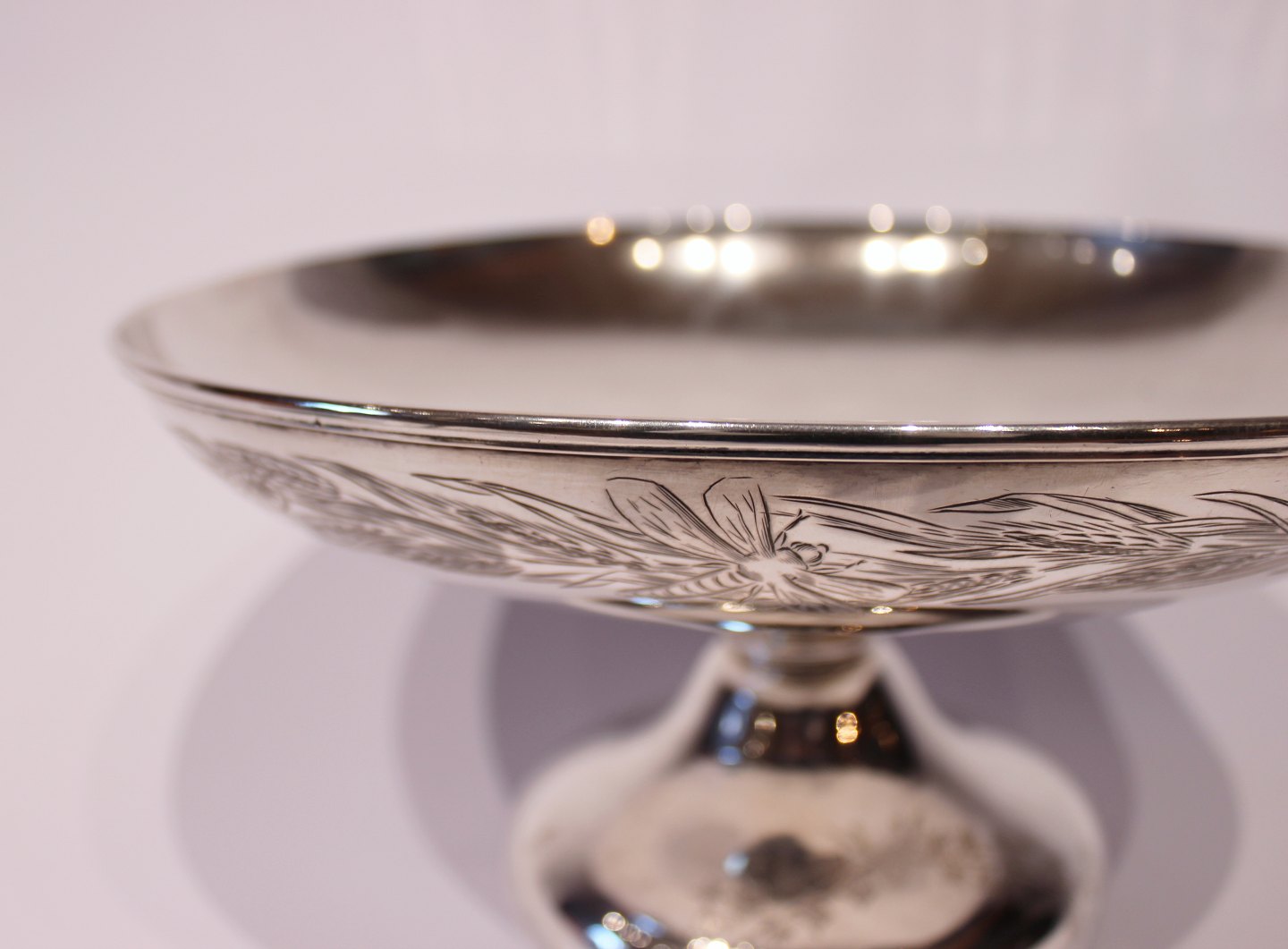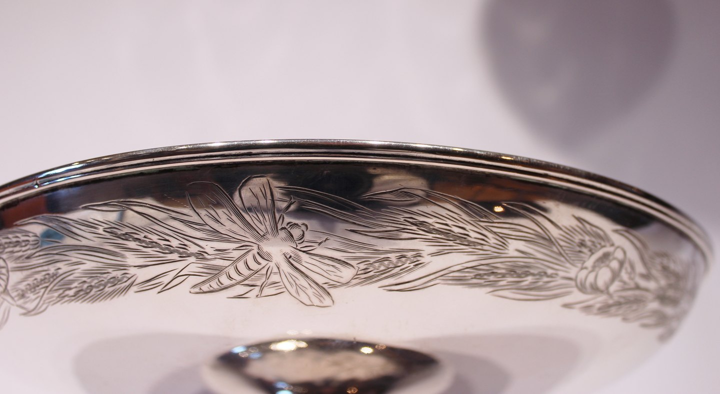 Stor opsats af tretårnet sølv dekoreret med blomster og bier på siden, stemplet Clement.