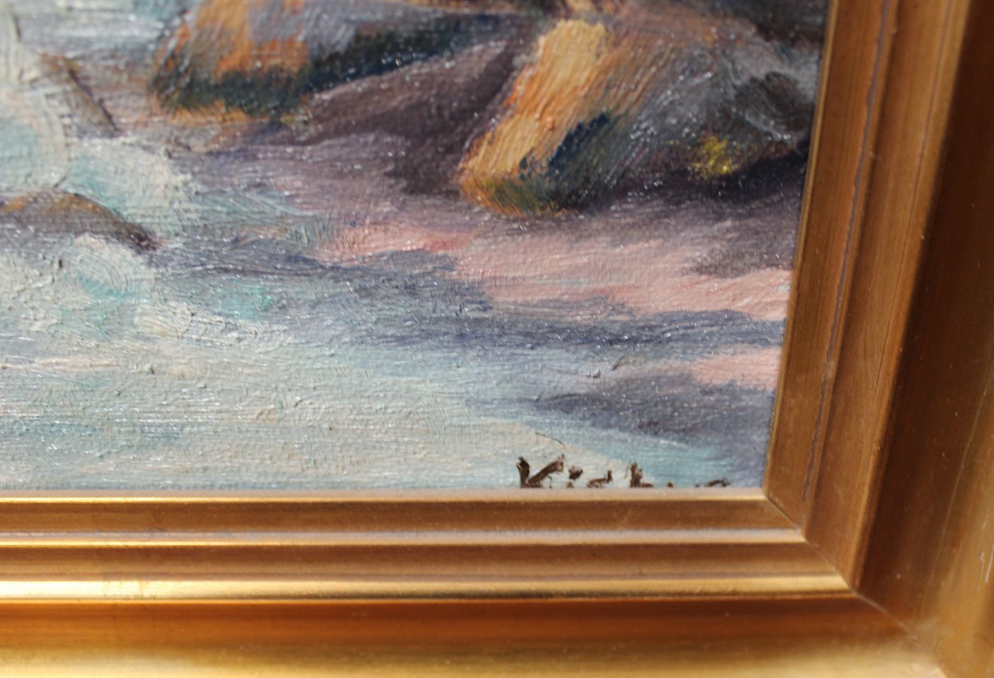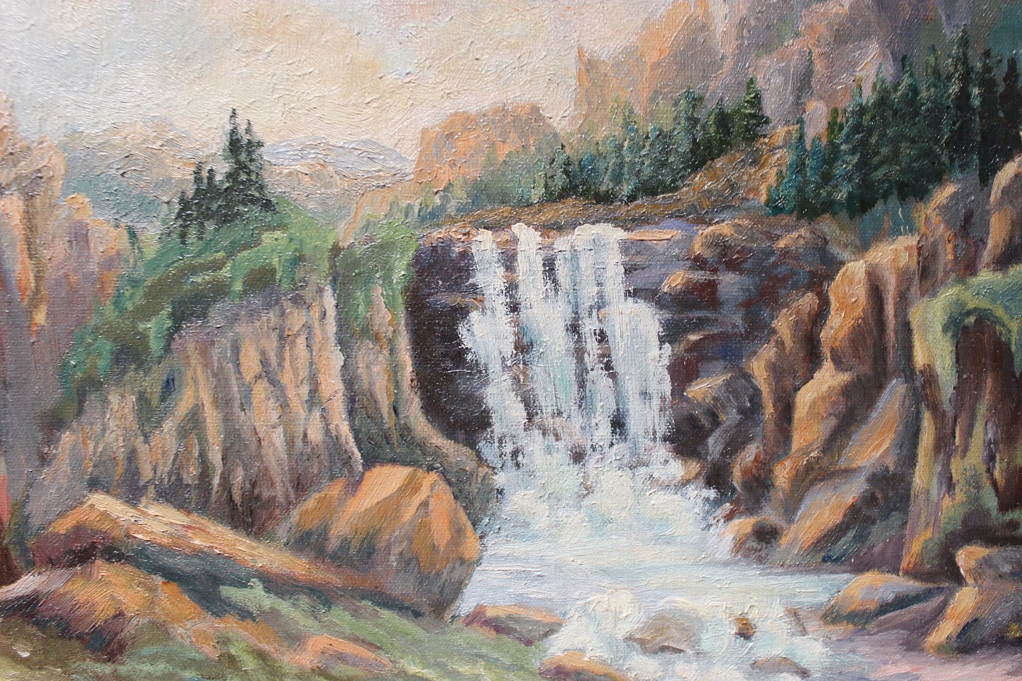 Oliemaleri med motiv af vandfald og klipper, med forgyldt ramme. Maleriet er signeret af en ukendt dansk kunster.