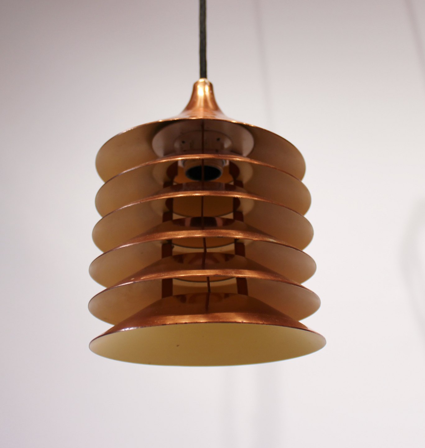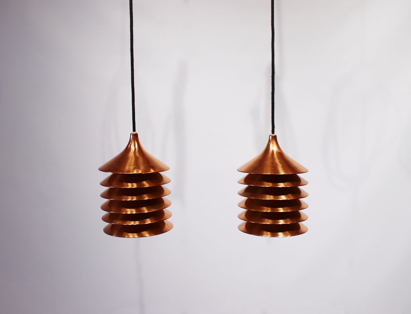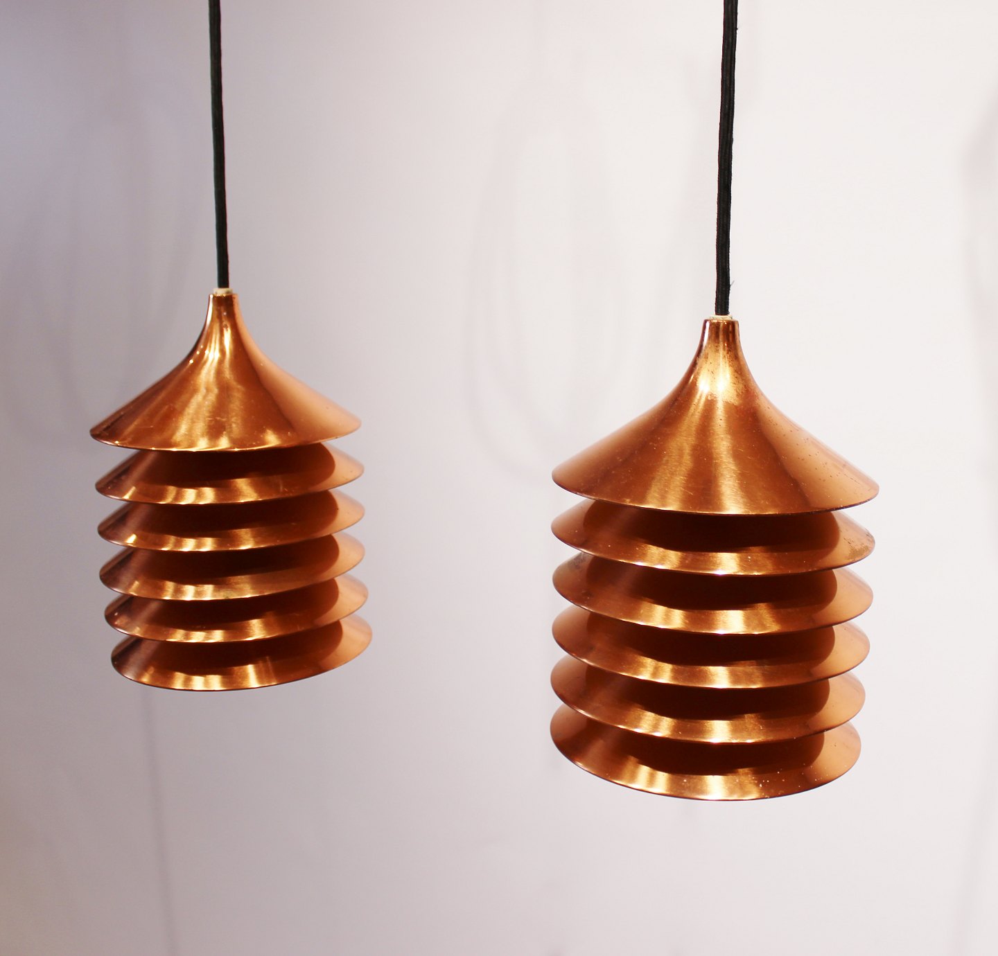 Et par, Duett, kobberpendler designet af Bent Boysen i 1970erne. Lamperne er i flot brugt stand med ny sort stofledning.