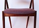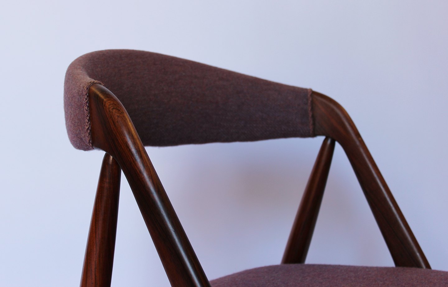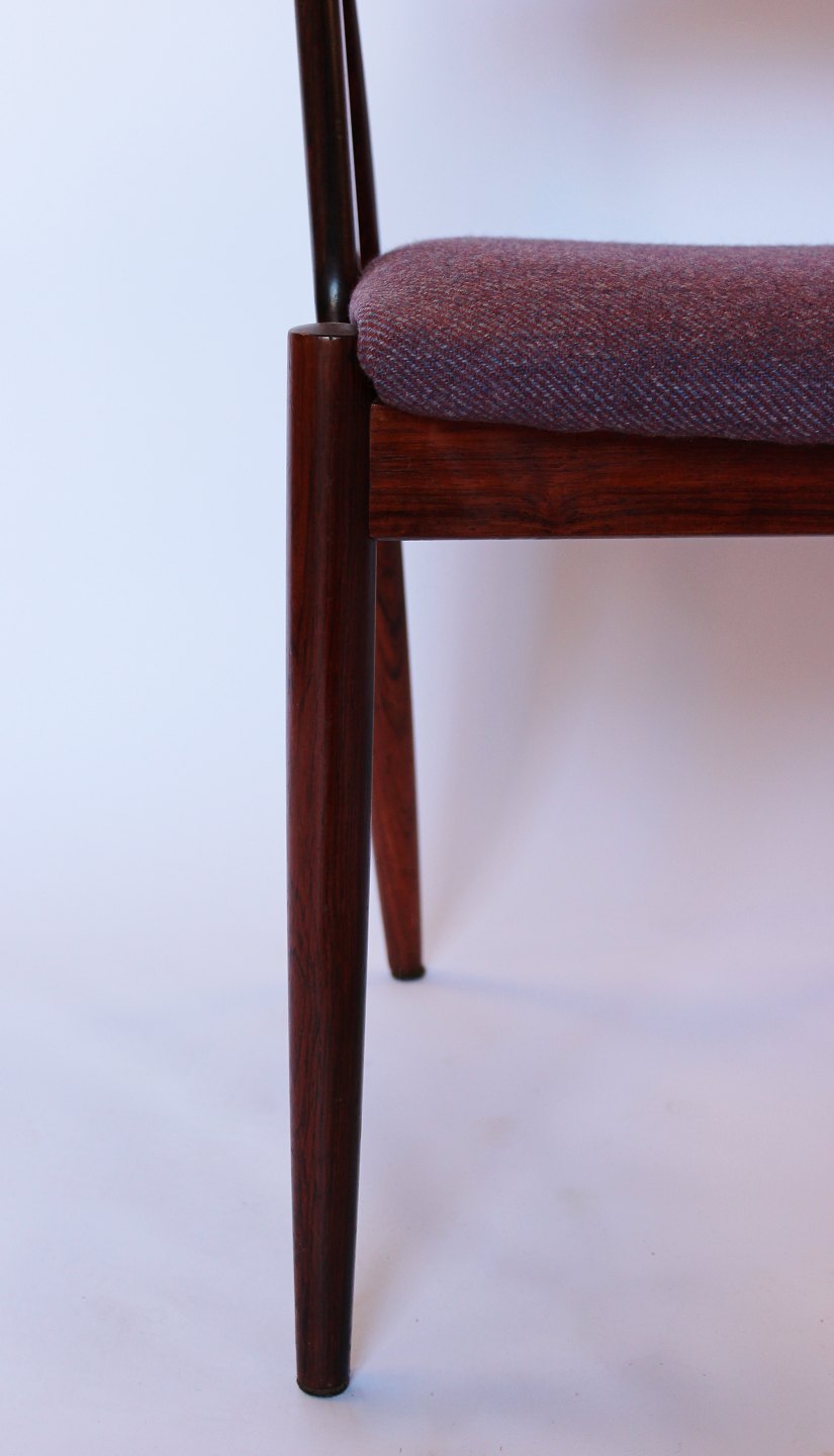 SolgtEt sæt af fire spisestuestole, model 31, designet af Kai Kristiansen i 1956 og fremstillet hos Schou Andersen i 1960erne. Stolene er i palisander og polstret med lilla stof.