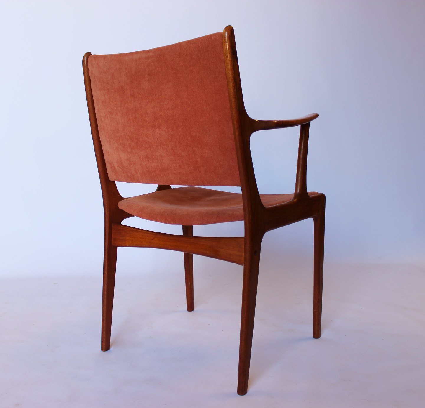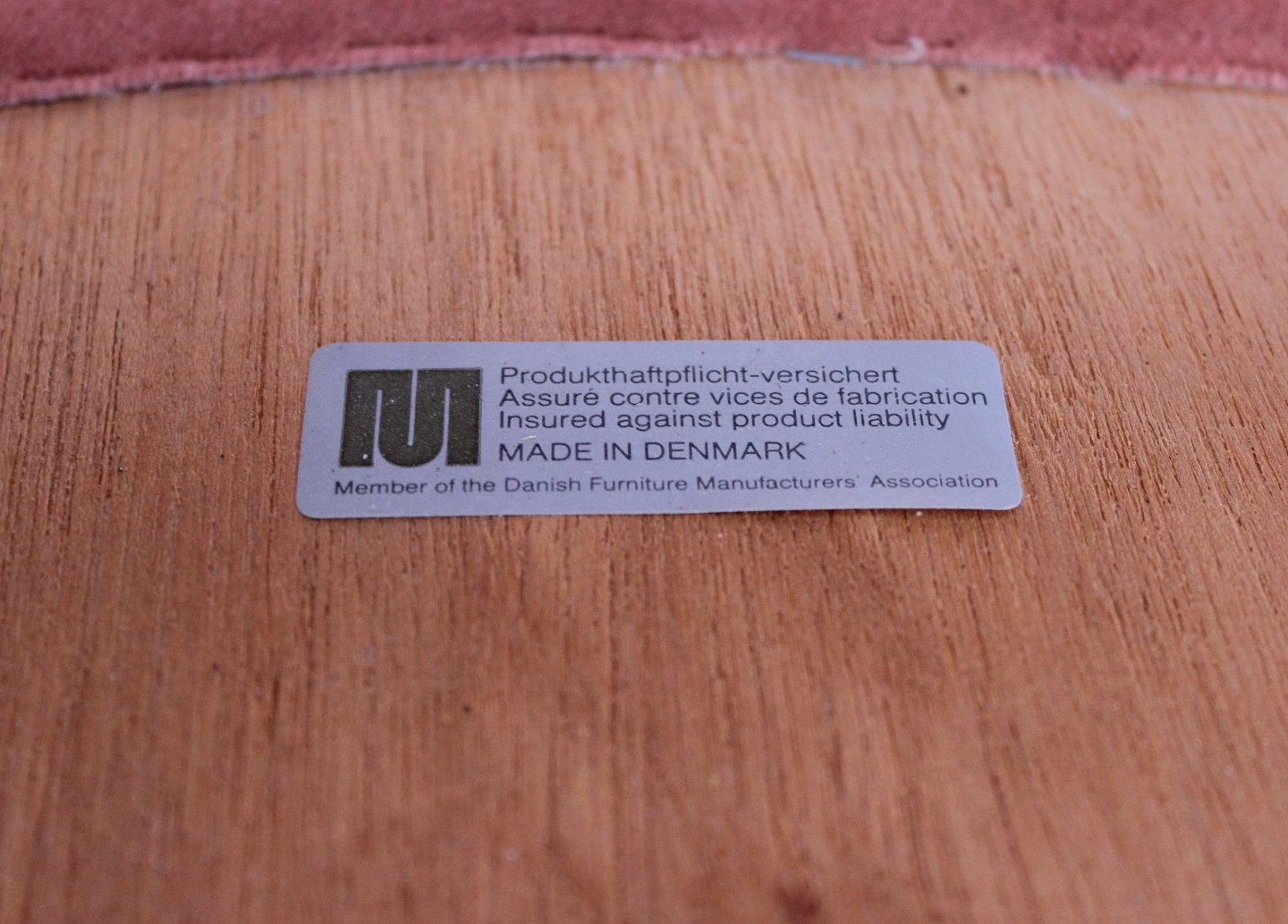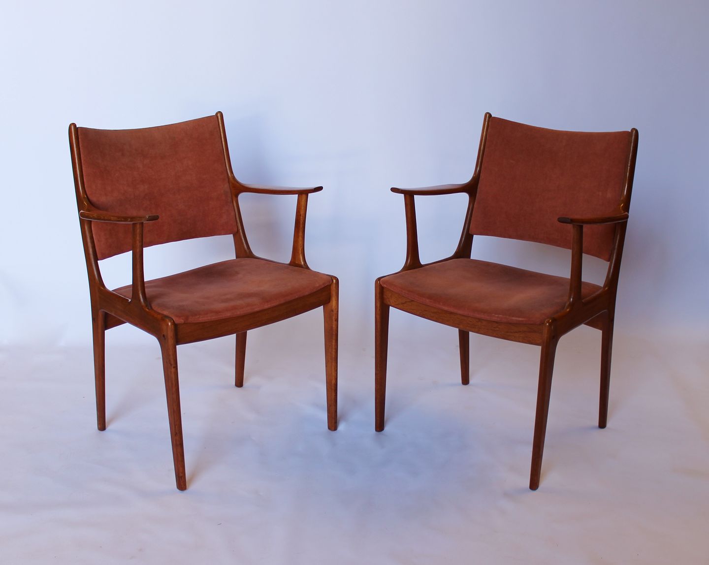 SoldSet of 2 arm chairs in teak and pale pink suede designed by Johannes Andersen and manufactured by Uldum Furniture Factory in the 1960s.