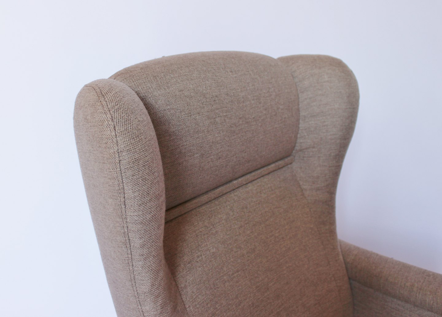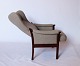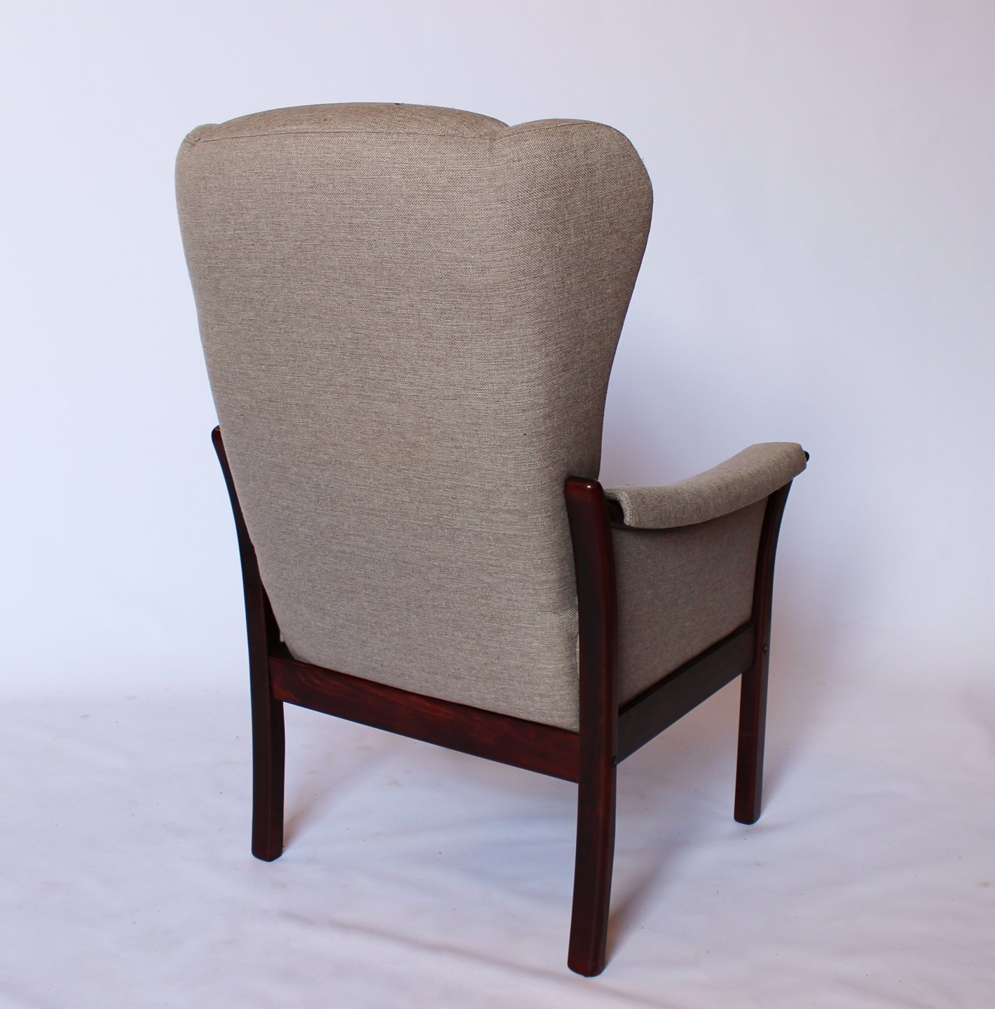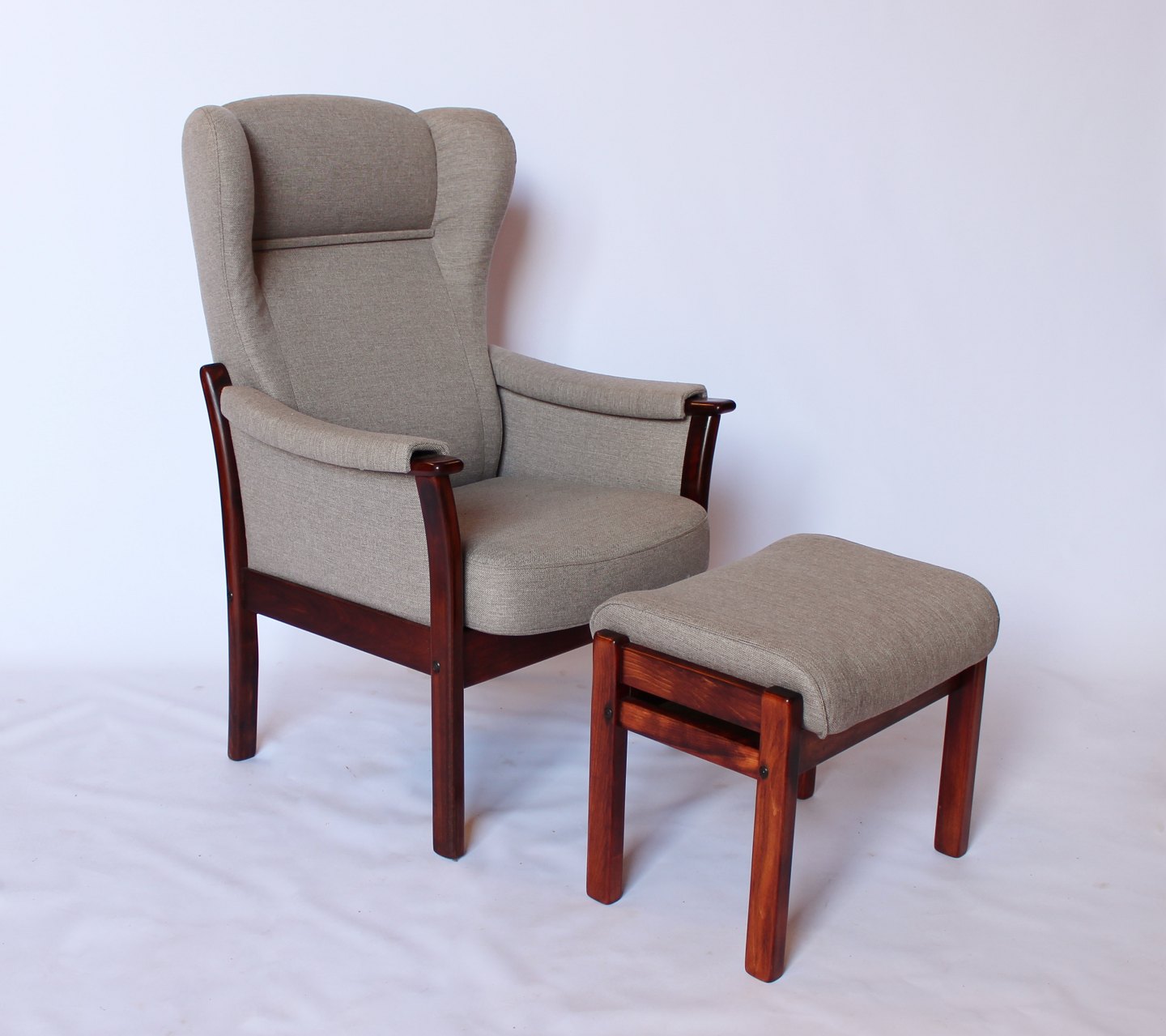 This set of two recliners with matching stools is the perfect combination of comfort, functionality and style. They have been newly upholstered in a beautiful light gray fabric, which adds a modern and fresh touch to the furniture. The dark wood contributes a warm and natural contrast to the light fabric, and it emphasizes the timeless design. The chairs are designed to recline for extra comfort and flexibility, and the height of the stools can be adjusted to meet individual needs. With their elegant appearance and practicality, this set of recliners and stools will be a welcome addition to any home where both comfort and aesthetics are valued.
