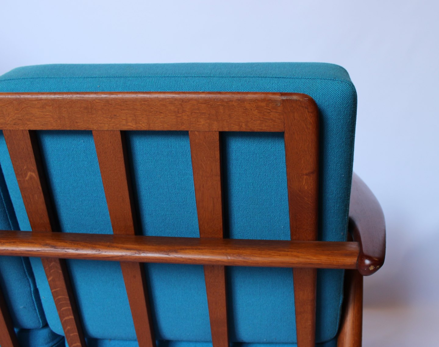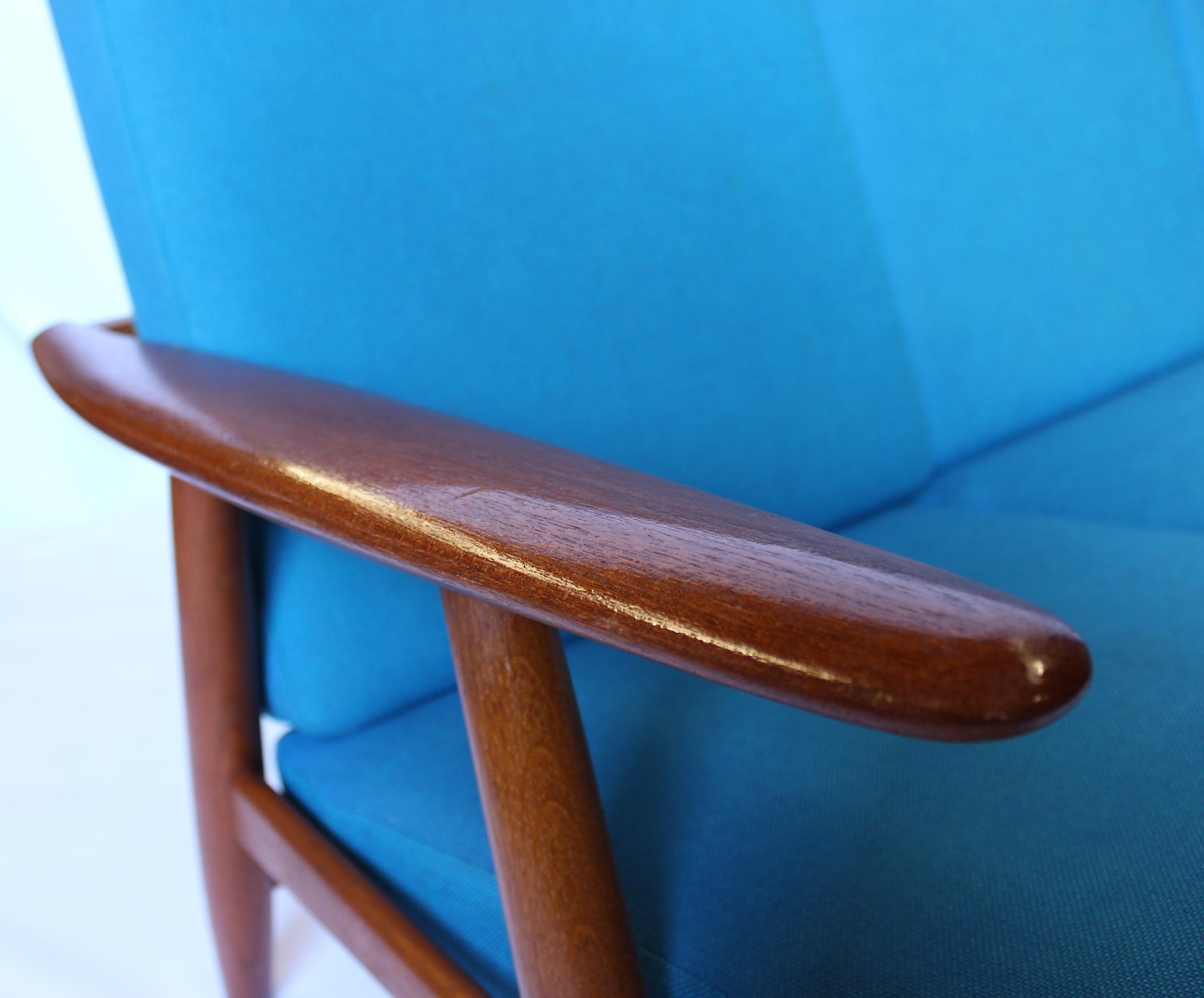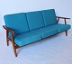 "The Cigar" 3 seater sofa, model GE240/3 designed by Hans J. Wegner and manufactured by Getama in the 1960s. The sofa is of teak and upholstered in dark blue Hallingdal.