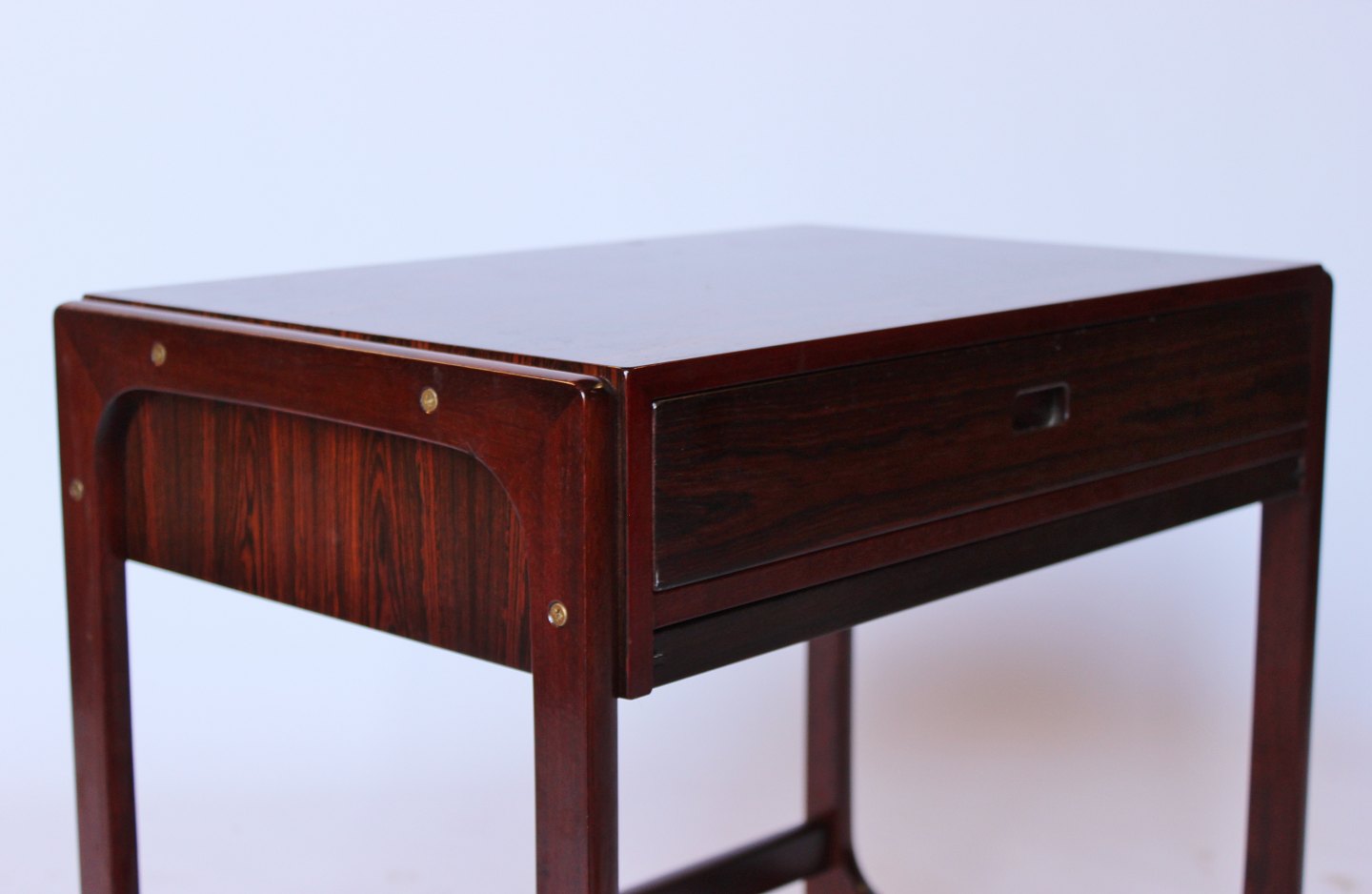 This small sewing table exudes the classic elegance and functionality that characterizes Danish design from the 1960s. Made from rosewood, a material known for its warm color and beautiful grain, the table adds a sophisticated atmosphere to any room.