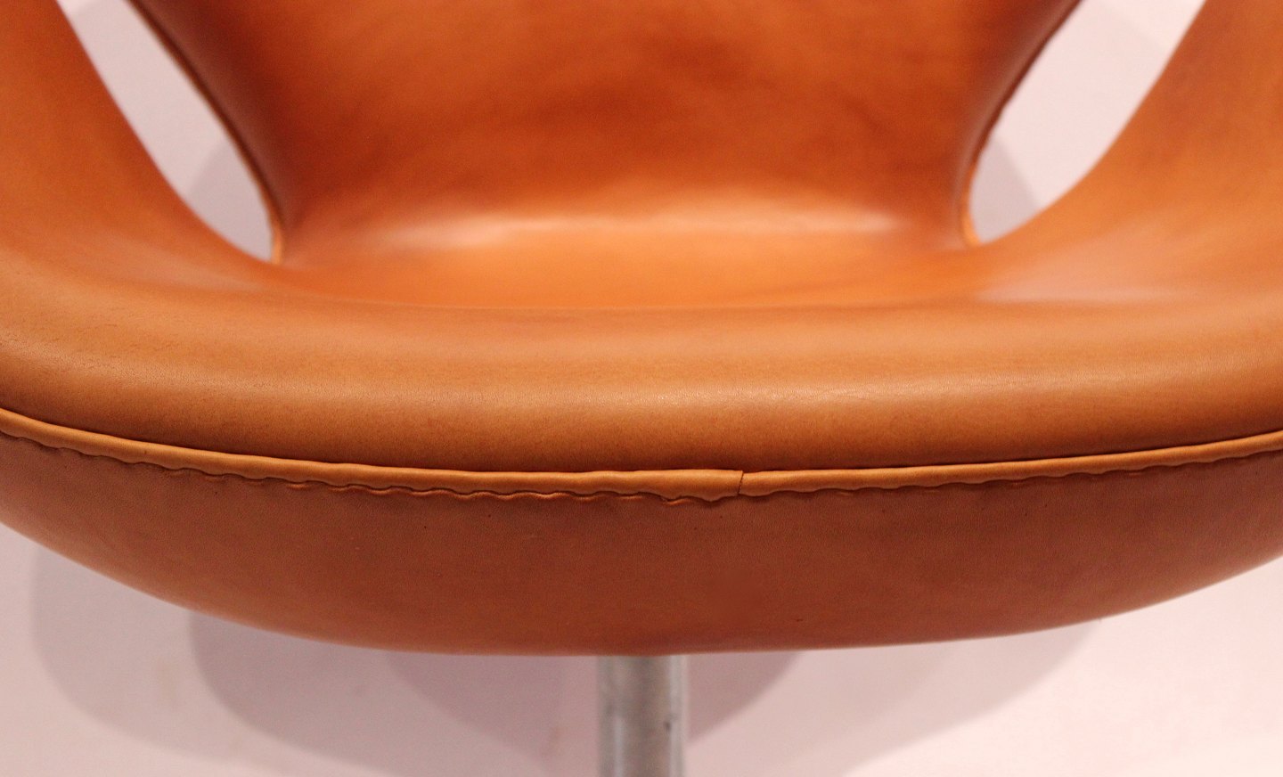 Den polstrede version af Svane stolen, som du nævnte, er betrukket med cognac læder, hvilket tilføjer en luksuriøs følelse og varme til ethvert rum. Polstringen giver også en behagelig siddeoplevelse, der gør stolen ideel til både lounging og arbejde.