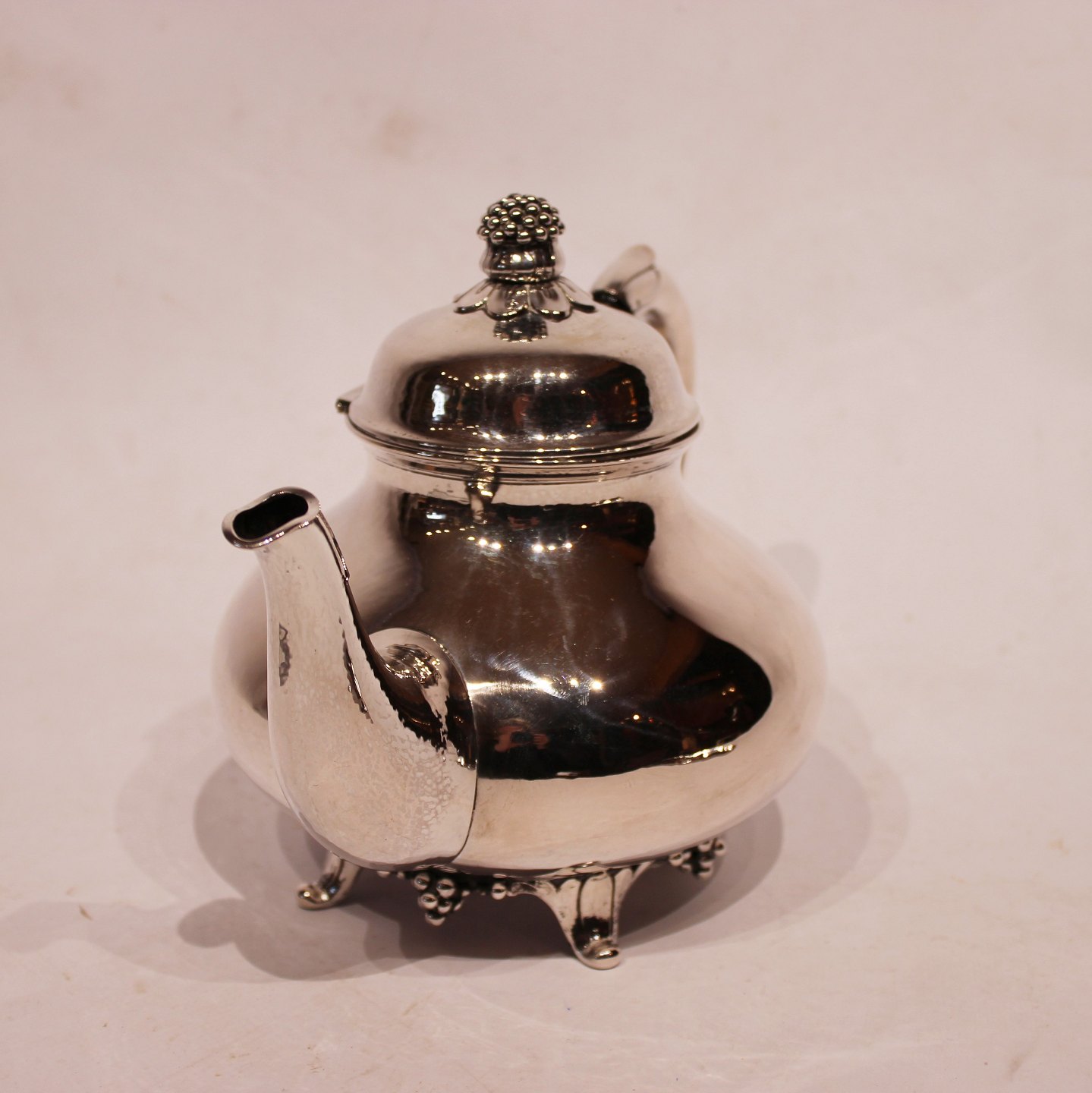 Tea pot of hallmarked silver decorated with grapes and on feet. The pot is in great vintage condition.