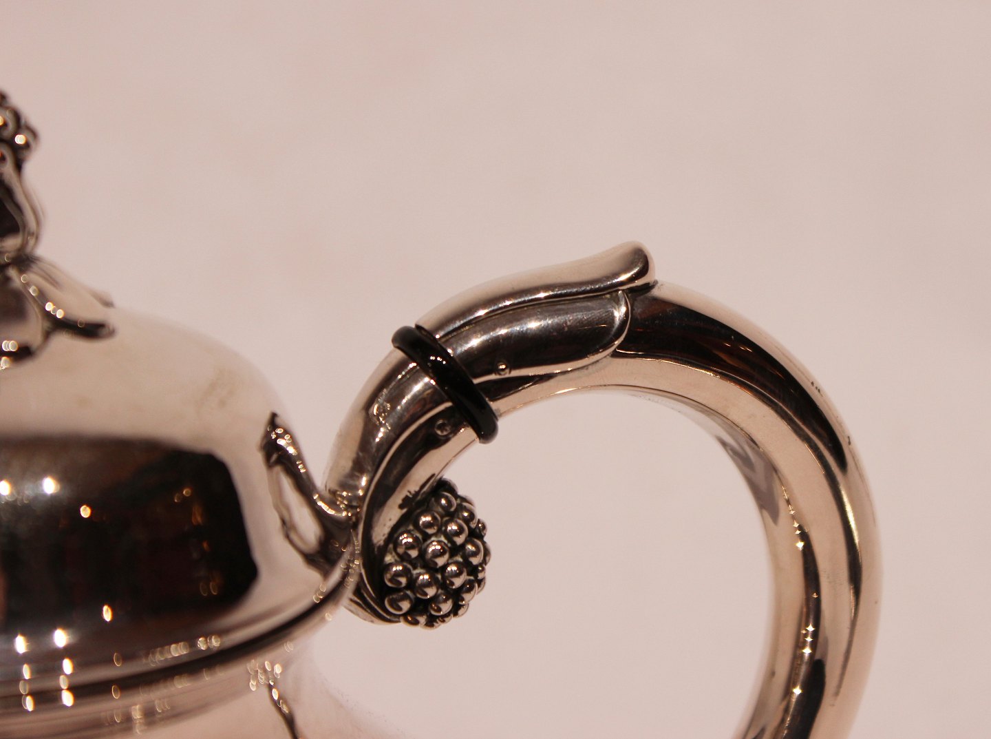 Tea pot of hallmarked silver decorated with grapes and on feet.